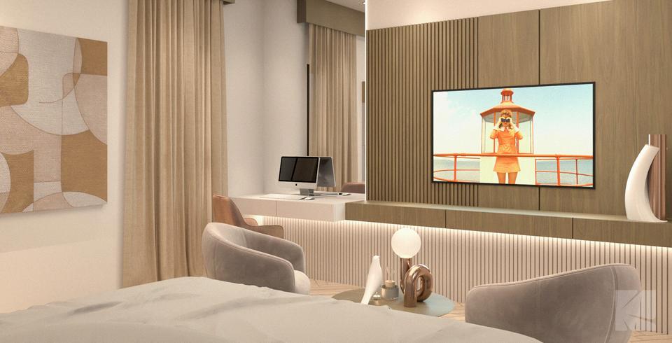 Contemporary Minimalist bedroom incorporating neutral palette, natural wood, soft & diffused lighting, and a clutter-free design is the epitome of modern tranquility The soft, muted colors create a peaceful ambiance, while the uncluttered layout provides a sense of order and calm The gentle lighting casts a warm glow across the room, inviting you to rest and relax. The furnishings are simple, with clean lines and minimal ornamentation, allowing the space to breathe and providing an unobtrusive backdrop to your dreams It is a space of clarity, simplicity, and quiet beauty - a true reflection of the contemporary minimalist design philosophy