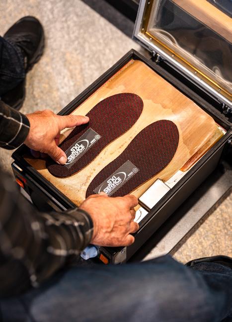 and whether they prefer comfort or performance,” Thomas explains. The guest first steps into the outer shell without the inner boot. “That’s how we see if the shape really fits,” he adds. “It shouldn’t be too tight, but it shouldn’t be too loose either.” Only then does the guest try on the full ski boot.