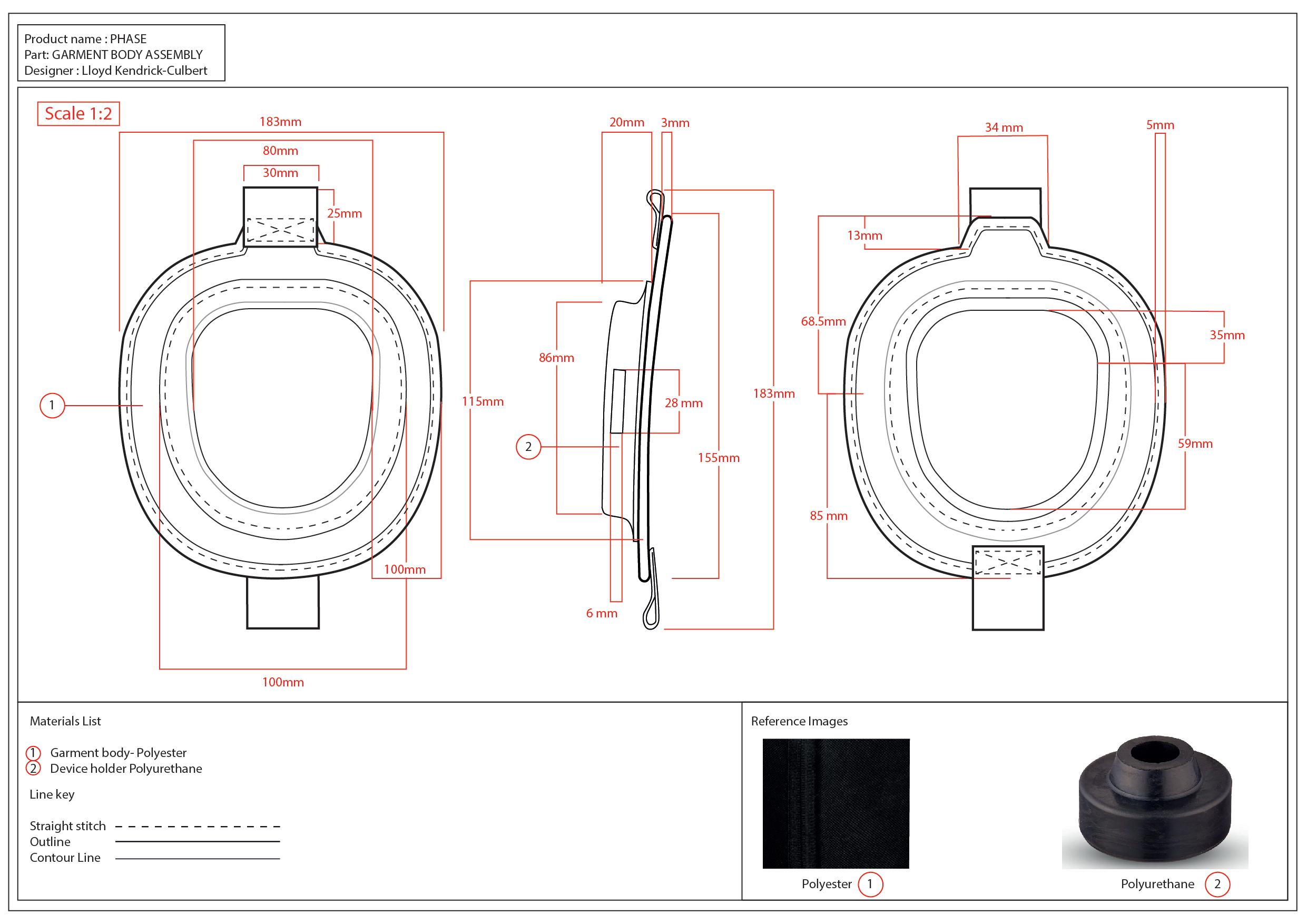 Properties required for the garment fabric were UV resistance, elasticity, and wear resistance for 1000 uses. CES did not have plastics woven into as a fabric therefore existing products such as a gym shark bag justified the material choice. Desired properties for the device holder were flexibility, softness and greater strength compared to the fabric. Elastomer’s were the best option and on CES, Polyurethane was the cheapest with the highest yield strength followed by natural rubber. Polyurethane could also be 3D printed and moulded.
