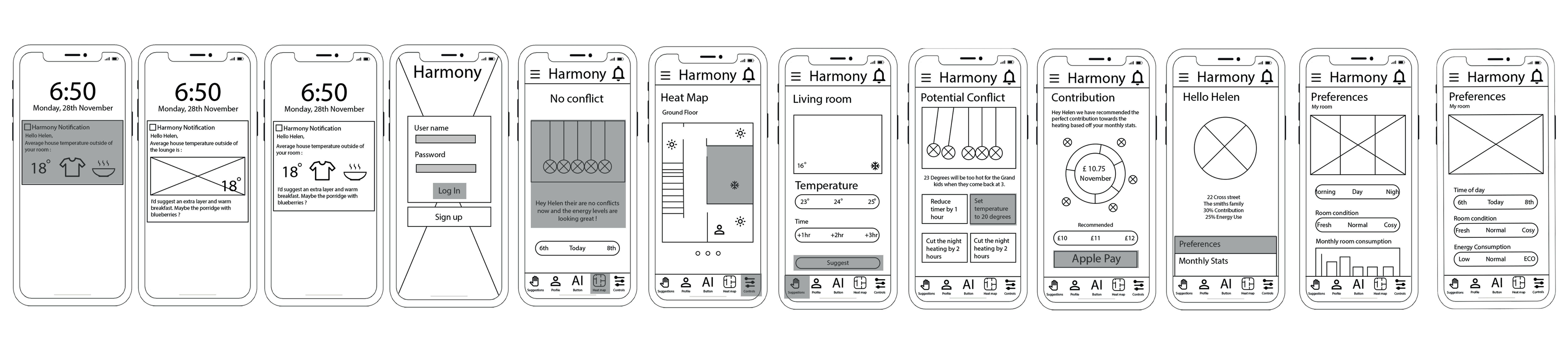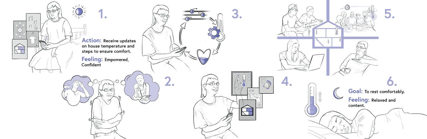 The storyboard focuses on Helen's average day in the new home. She would use the app less in the evening, spending time with her family compared to mid-day. In the day Harmony allows Helen to change the temperature whilst presenting heating conflicts with other family members. Also, the AI service will give recommendations to prevent heating changes. E.g. Helen wakes up with Harmony telling the temperature inside the home and appropriate clothing to wear, preventing her from being cold.