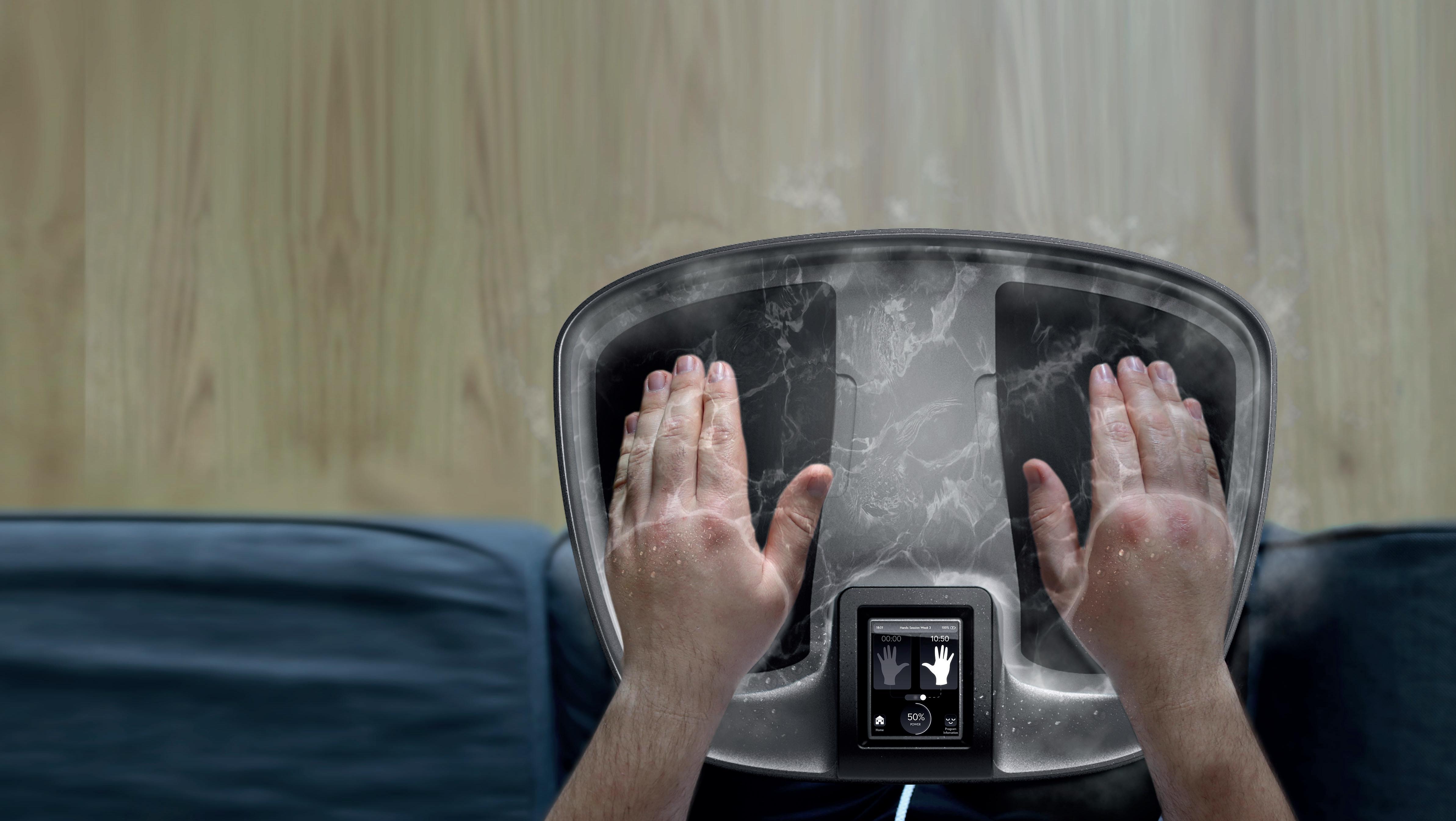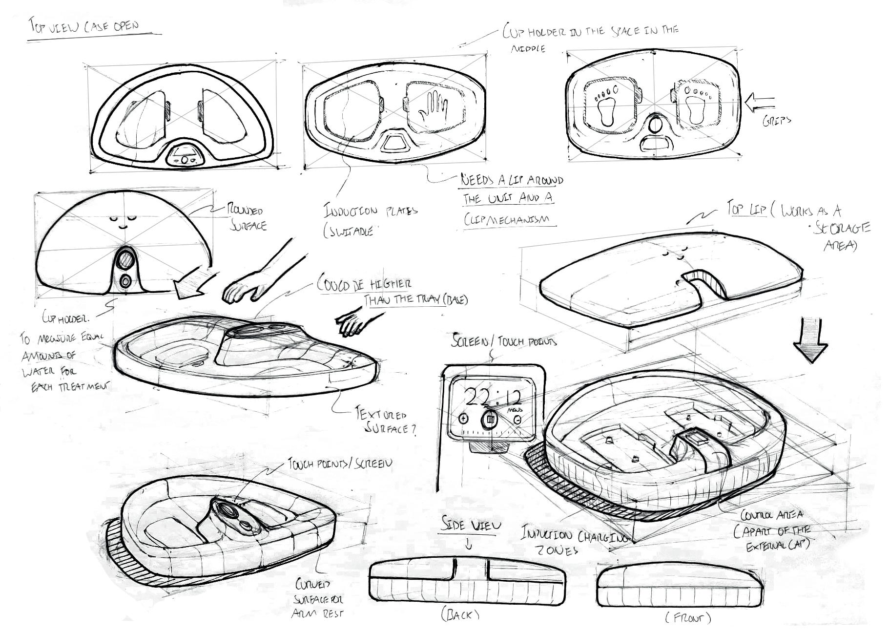 Insights highlighted the importance of pride consumers would need to use Palm daily due to the embarrassment of the condition. Concept sketches focused on a professional, slick design compared to a medical look from existing devices. Current Iontophoresis treatments are uncomfortable to use so the ergonomics needed to be sound as Palm works for both hands and feet. Cardboard prototyping allowed for rapid testing for the dimensions finding the balance between size and usability.
