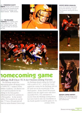 nomecomins game julldogs Roll O ver TCA for H om ecom ing V ictory The Bulldogs started the pmecoming game off strong versus le TAPPS No. 1 ranked Trinity Ipristian Academy. Lyn Barnes ran ! r a 6-yard touchdown for the : illdogs in the first quarter. ; irkburnett held TCA scoreless in e first quarter. In the second darter, TCA scored to tie up the I ime 7-7 but a 93-yard kick-off turn by senior Keaton Green kept