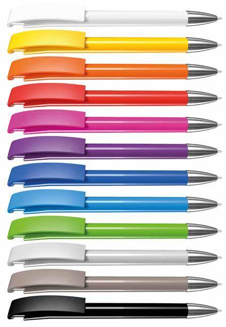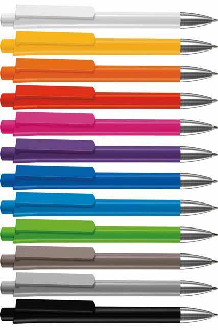 - Couleurs disponibles : choix de 9 couleurs opaques pour le corps – clip en 9 couleurs opaques et 8 couleurs transparentes. - Attributs : métal satiné - Mécanisme : bouton poussoir
