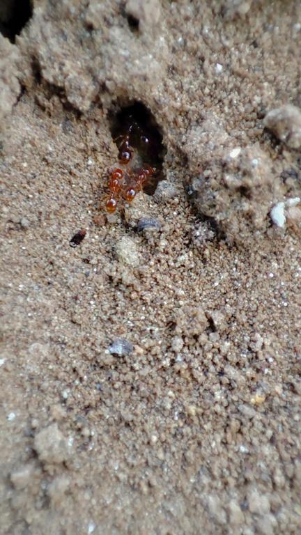 En esta fotografía podemos apreciar a unas hormigas rojas que están a punto de entrar a su hormiguero. Se puede ver un increíble brillo en el cuerpo de las hormigas resaltando su color y fisiología.