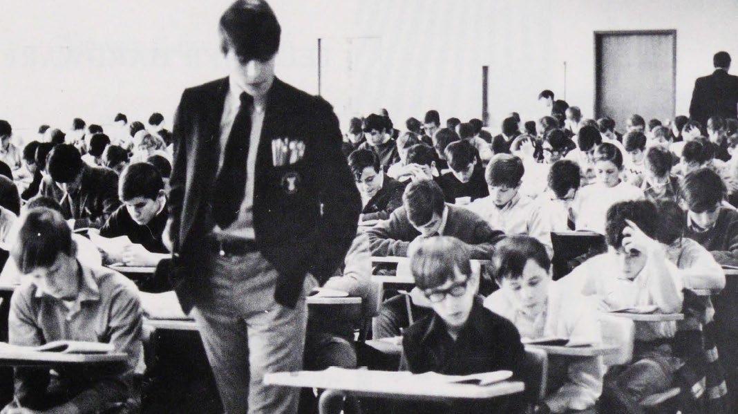 • As a new Freshman, we entered school from the Emerson side of the building. Due to now doubling the number of students, classes were held on both the 1st and 2nd floors. Your 14 year-old self is wearing a maroon blazer with tie from Bond Clothing that your mom bought at their downtown store. School colors and a mascot (Spartan) had been chosen by the class of ’71. With Mike & Pat Finnegan in our class, there were now three Finnegans in the building!