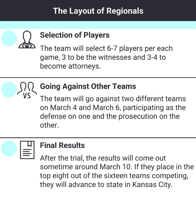 The regionals will consist of two rounds on March 4 and March 6 in which the school’s team will rotate between the prosecution and the defense. If they are able to finish in the top eight, they will move on to the state tournament in Kansas City.