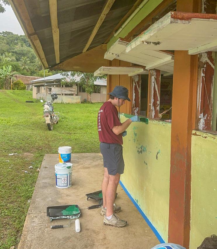Michael Scally ‘26 repaints the school in Indian Creek Belize. After the students arrived on January 25th, they worked from Monday to Thursday on repainting and repairing the damage that had been done to the building. The revitalization of the school building had a great effect on the Indian Creek community, as many from the village came to visit, and even help with the work being done to the building. After they finished, the community loved what was done to the building, and they took great pride in their new look building.