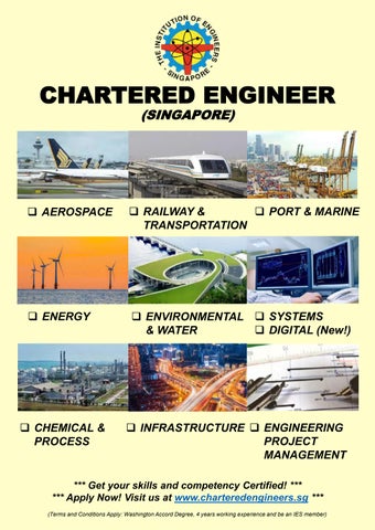 CHARTERED ENGINEER (SINGAPORE) *** Get your skills and competency Certified! *** *** Apply Now! Visit us at www.charteredengineers.sg *** (Terms and Conditions Apply: Washington Accord Degree, 4 years working experience and be an IES member) ❑ AEROSPACE ❑ ENERGY ❑ &ENVIRONMENTALWATER ❑ CHEMICAL & PROCESS ❑ SYSTEMS ❑ DIGITAL (New!) ❑ PORT & MARINE❑ RAILWAY TRANSPORTATION& ❑ INFRASTRUCTURE ❑ MANAGEMENTPROJECTENGINEERING