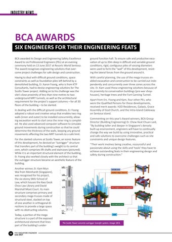 SIX ENGINEERS FOR THEIR ENGINEERING FEATS BCA awarded its Design and Engineering Safety Excellence Award to six Professional Engineers (PEs) at an evening ceremony held on 13 June 2017 at Resorts World Sentosa. The award recognises engineering solutions that overcome project challenges for safe design and construction.