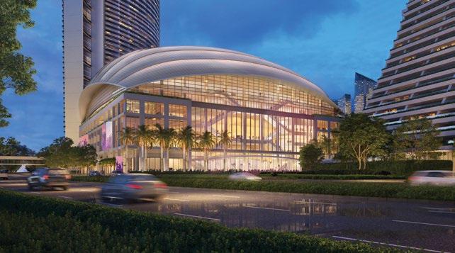 The pioneering project will feature a soaring 570-suite luxury hotel tower capped with signature rooftop and dining experiences, luxury retail boutiques, gaming, holistic spa and wellness amenities, and approximately 200,000 ft2 of premium meeting space. A purpose-built 15,000-seat arena situated against the stunning backdrop of Marina Bay aims to enhance the live entertainment