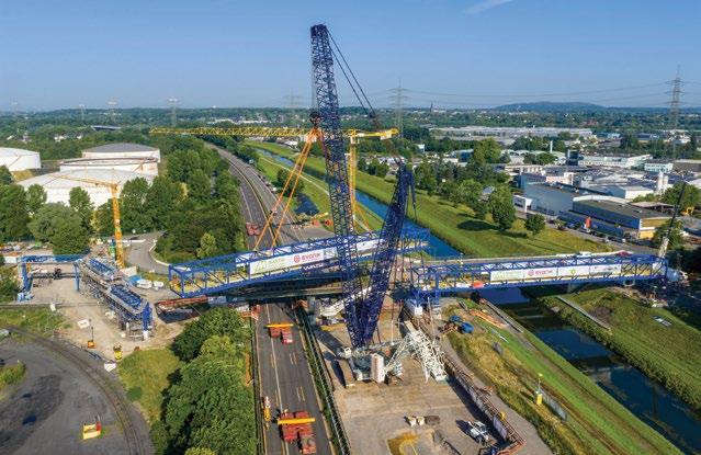 As part of a complex infrastructure project, WASEL GmbH deployed two LR 11000 crawler cranes from Liebherr for a spectacular mission on the A42 between Bottrop and Essen, in Germany. An old concrete pipe bridge needed to be replaced with a modern steel construction. The bridge connects refineries in the region with the Bottrop tank farm, crossing both the A42 and the River Emscher.