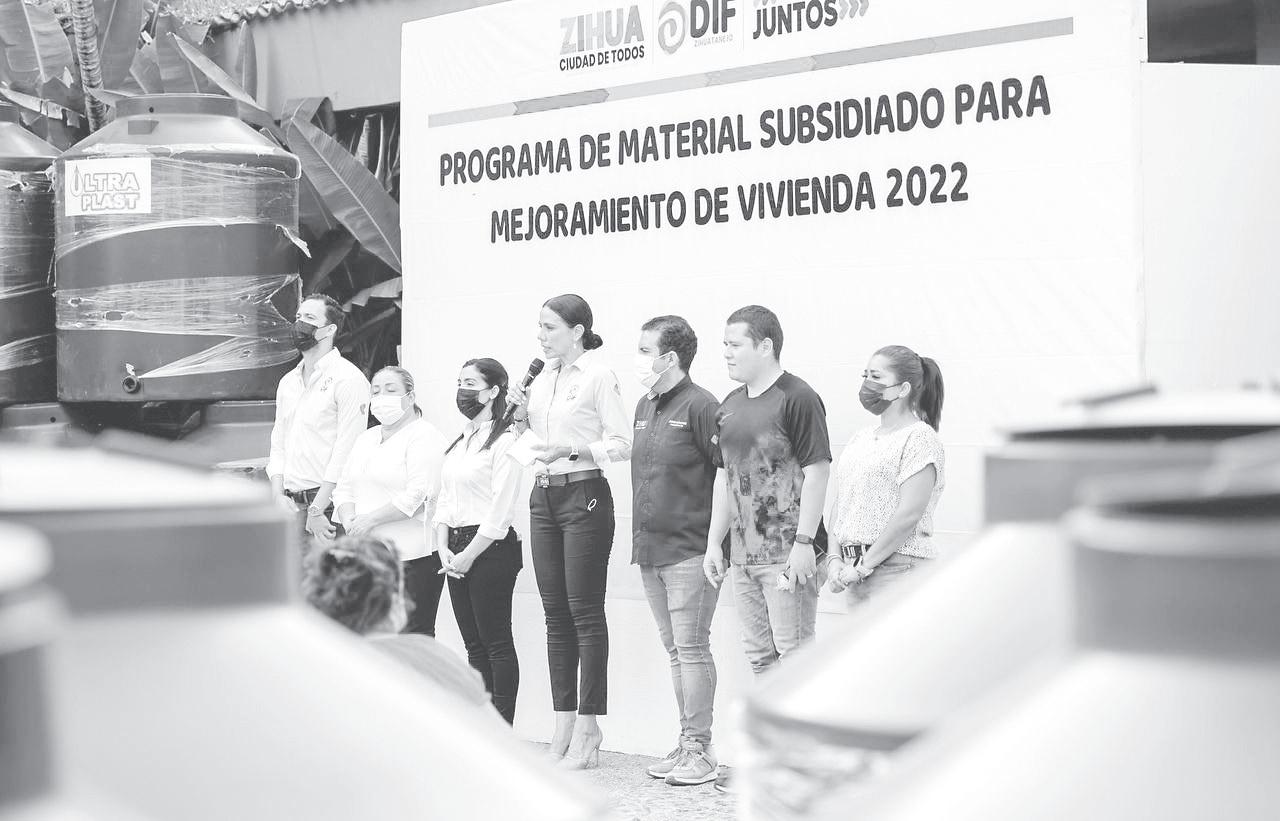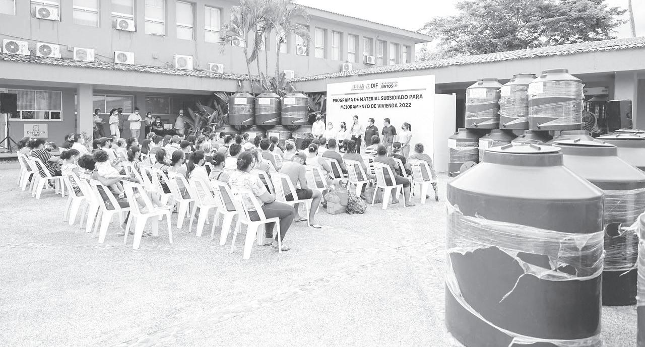 nueva entrega de apoyos del Programa para el Mejoramiento de Vivienda, los paquetes inclu yen materiales como cemento, lámina galvanizada, tinacos para almacenamiento de agua, pintura blanca e impermeabili zante, beneficiando con estos a un importante número de fa milias que habitan en diferentes colonias del puerto.
