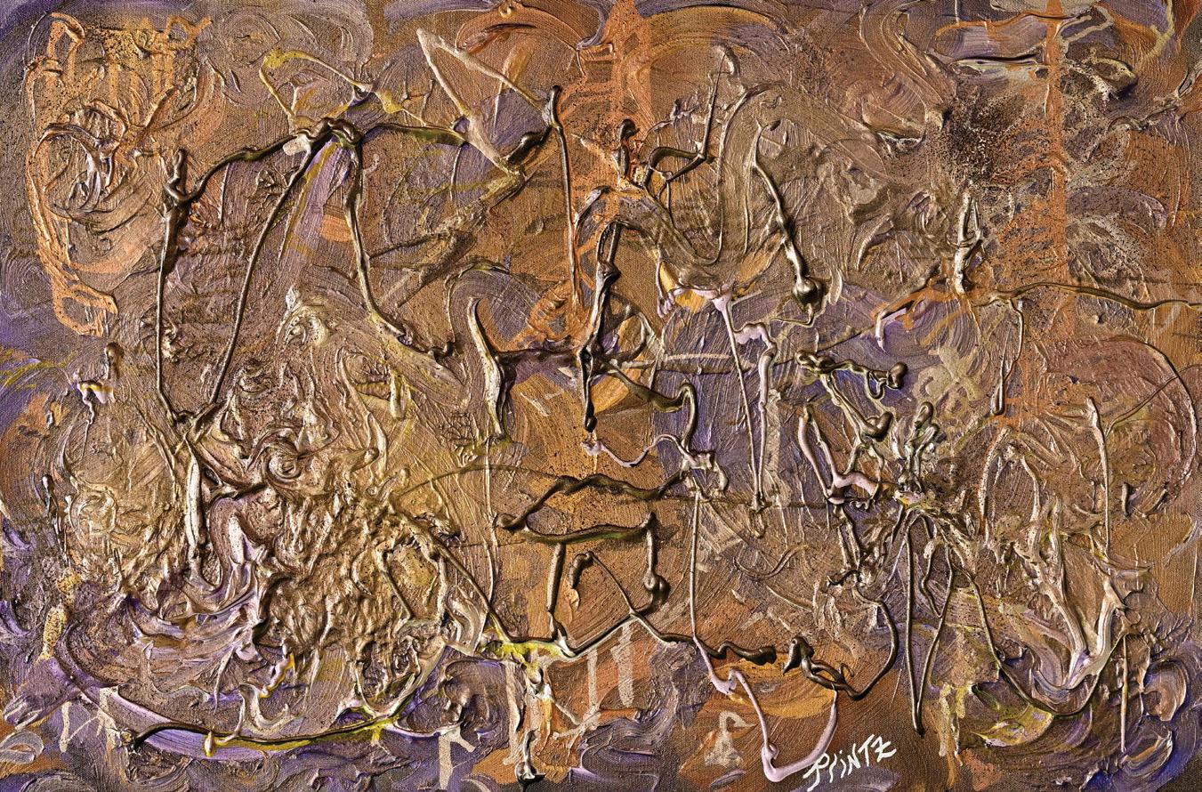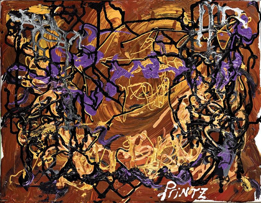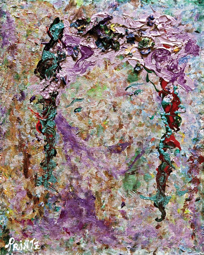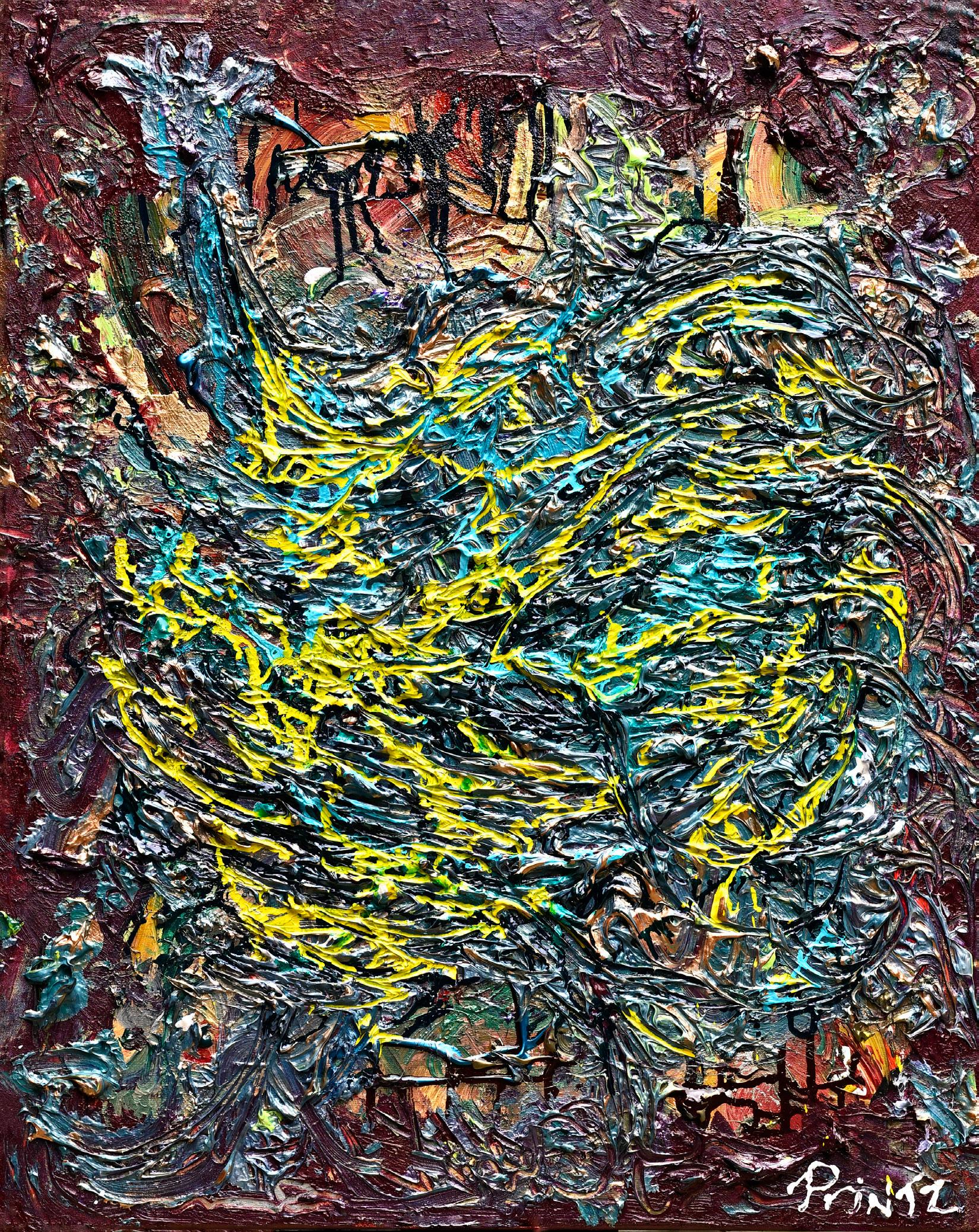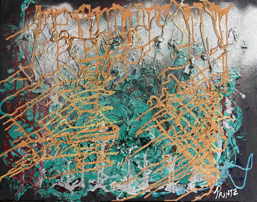 Printz possesses an instinctive understanding of how abstraction can speak without words. In HYBRID, SABER, TANGLE, and HOTROD, the tension between turbulence and harmony creates a dynamic interplay of gesture and form. MUSIC, HELLO, and ETHEREAL unfold like dense, shimmering ecosystems, living terrains where color behaves like light moving through space. In PASTELS, DIAMOND, and SEAFOAM, the palette softens into soft greens, pastels, and violets, revealing her gift for creating emotional atmosphere through hue alone. Works such as SHE, FIRST, DÉTENTE, and ON MY MIND hint at figures, memories, or states of mind emerging through abstraction, demonstrating her intuitive ability to weave suggestion into even her most expressive pieces.