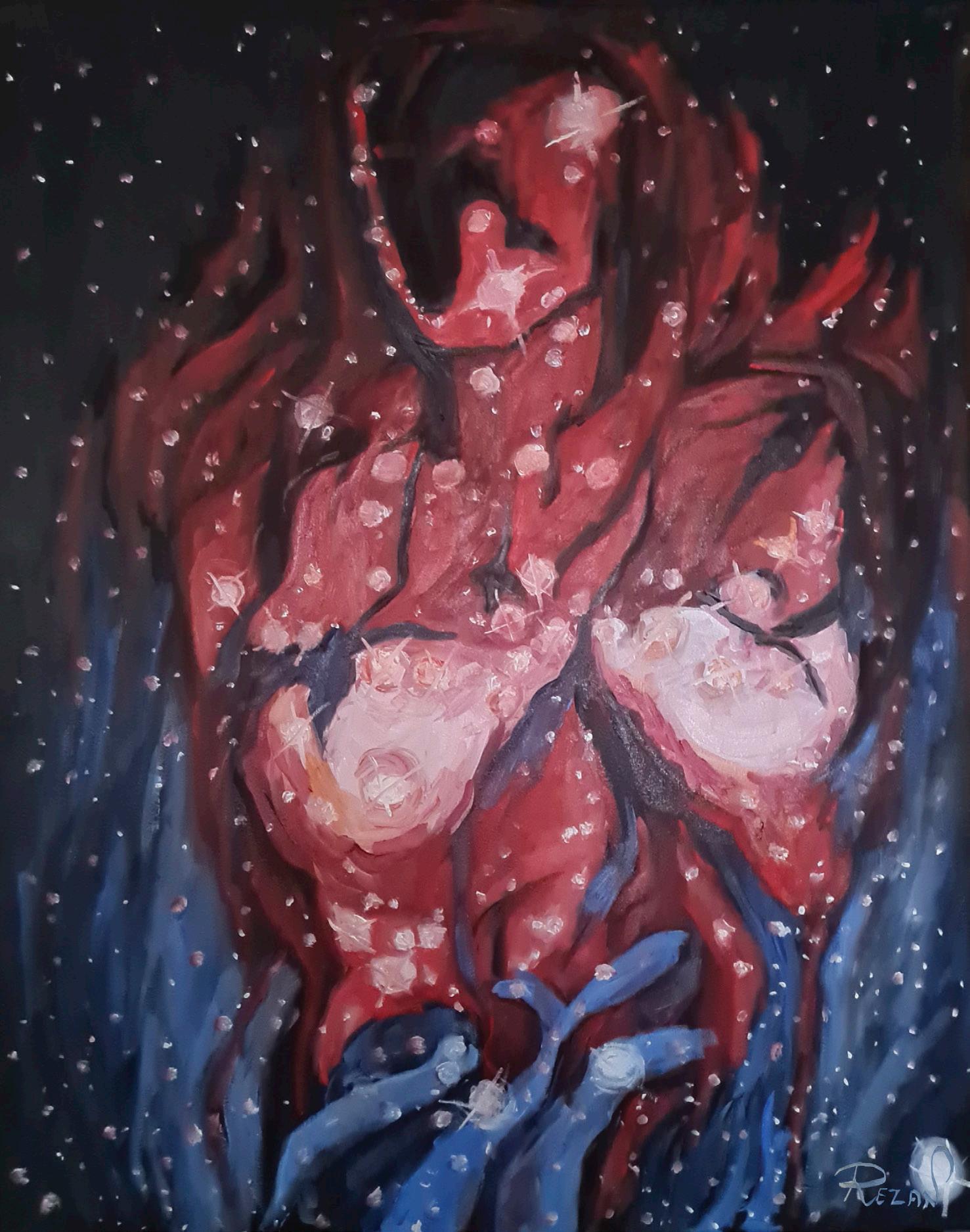 Freya Kazemi, an Iranian-Canadian self-taught artist, is known for her spiritual abstract paintings. Born in Tehran, she graduated in General Painting from Azad University and managed her own gallery to support emerging artists. Initially focused on realism, her style evolved into expressive abstraction, incorporating bold textures, copper, and gold sheet collages inspired by Persian miniatures, poetry, and the Quran. The pandemic marked a pivotal period, producing her masterpiece Resurrection. Since 2021, her work explores spiritual themes, blending mundane and transcendent realms, inviting viewers to contemplate deeper meanings. Kazemi continues to innovate and inspire across cultural and spiritual contexts.