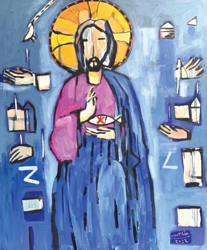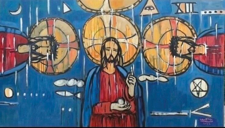 The Israeli Palestinian conflict remains an ongoing military and political struggle, and the artist seeks to express his personal perspective on this unending war. In the midst of violence and suffering, while His chosen people shed blood, God is portrayed as shedding tears.