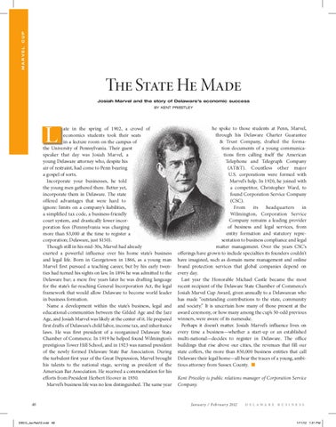 he spoke to those students at Penn, Marvel, through his Delaware Charter Guarantee & Trust Company, drafted the formation documents of a young communications firm calling itself the American Telephone and Telegraph Company (AT&T). Countless other major U.S. corporations were formed with Marvel’s help. In 1920, he joined with a competitor, Christopher Ward, to found Corporation Service Company (CSC). From its headquarters in Wilmington, Corporation Service Company remains a leading provider of business and legal services, from entity formation and statutory representation to business compliance and legal matter management. Over the years CSC’s offerings have grown to include specialties its founders couldn’t have imagined, such as domain name management and online brand protection services that global companies depend on every day. Last year the Honorable Michael Castle became the most recent recipient of the Delaware State Chamber of Commerce’s Josiah Marvel Cup Award, given annually to a Delawarean who has made “outstanding contributions to the state, community and society.” It is uncertain how many of those present at the award ceremony, or how many among the cup’s 50-odd previous winners, were aware of its namesake. Perhaps it doesn’t matter. Josiah Marvel’s influence lives on every time a business—whether a start-up or an established multi-national—decides to register in Delaware. The office buildings that rise above our cities, the revenues that fill our state coffers, the more than 850,000 business entities that call Delaware their legal home—all bear the traces of a young, ambitious attorney from Sussex County. n Kent Priestley is public relations manager of Corporation Service Company.