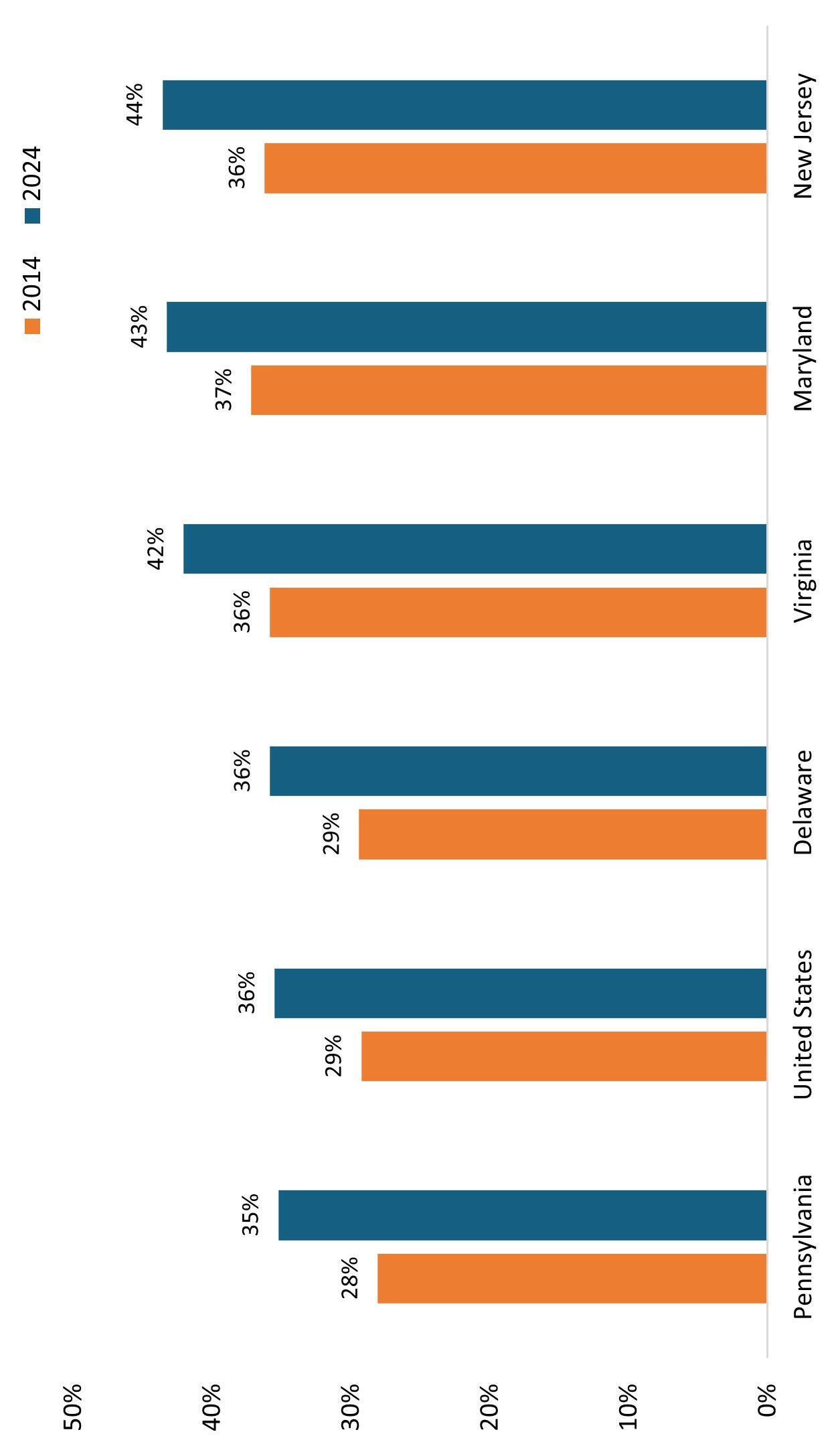 Remote work in the Philadelphia-Camden-Wilmington metropolitan area has continued to fall, ranking 24th in 2024 at 13 4%, compared with 16 9% in 2023 (19th) and 23 6% in 2021 (13rd) Pre-pandemic remote work in 2019 was 5 9% (23rd)