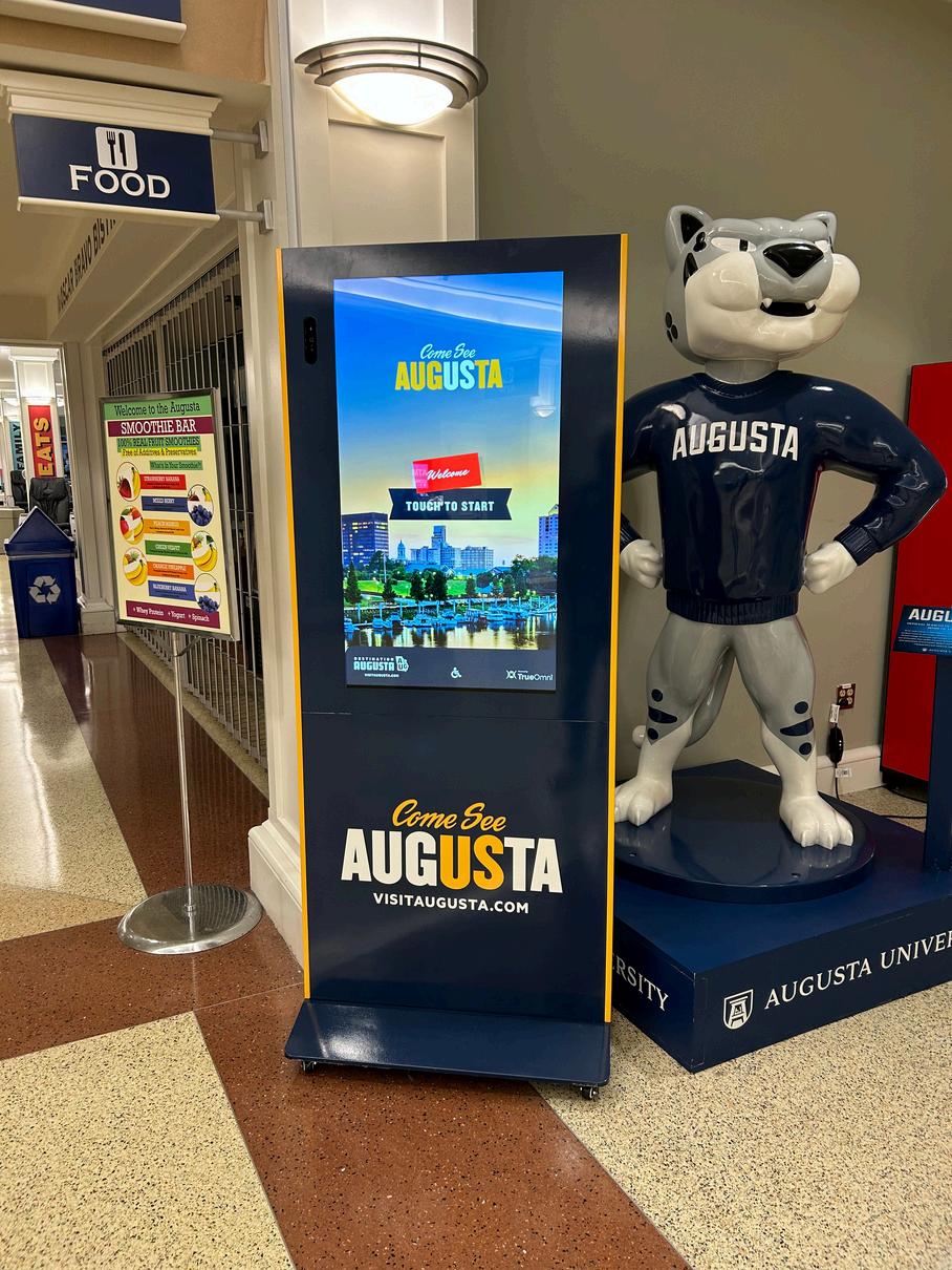This summer , Destination Augusta introduced interactive information kiosks to make it easier for visitors to explore the city , Two customized kiosks are now housed at key locationsthe Augusta Marriott at the Convention Center and the Augusta Regional Airport A third mobile kiosk traveled to major events throughout the year, at locations such as the Hull McKnight Georgia Cyber Center for Innovation, Bell Auditorium, and Augusta & Co