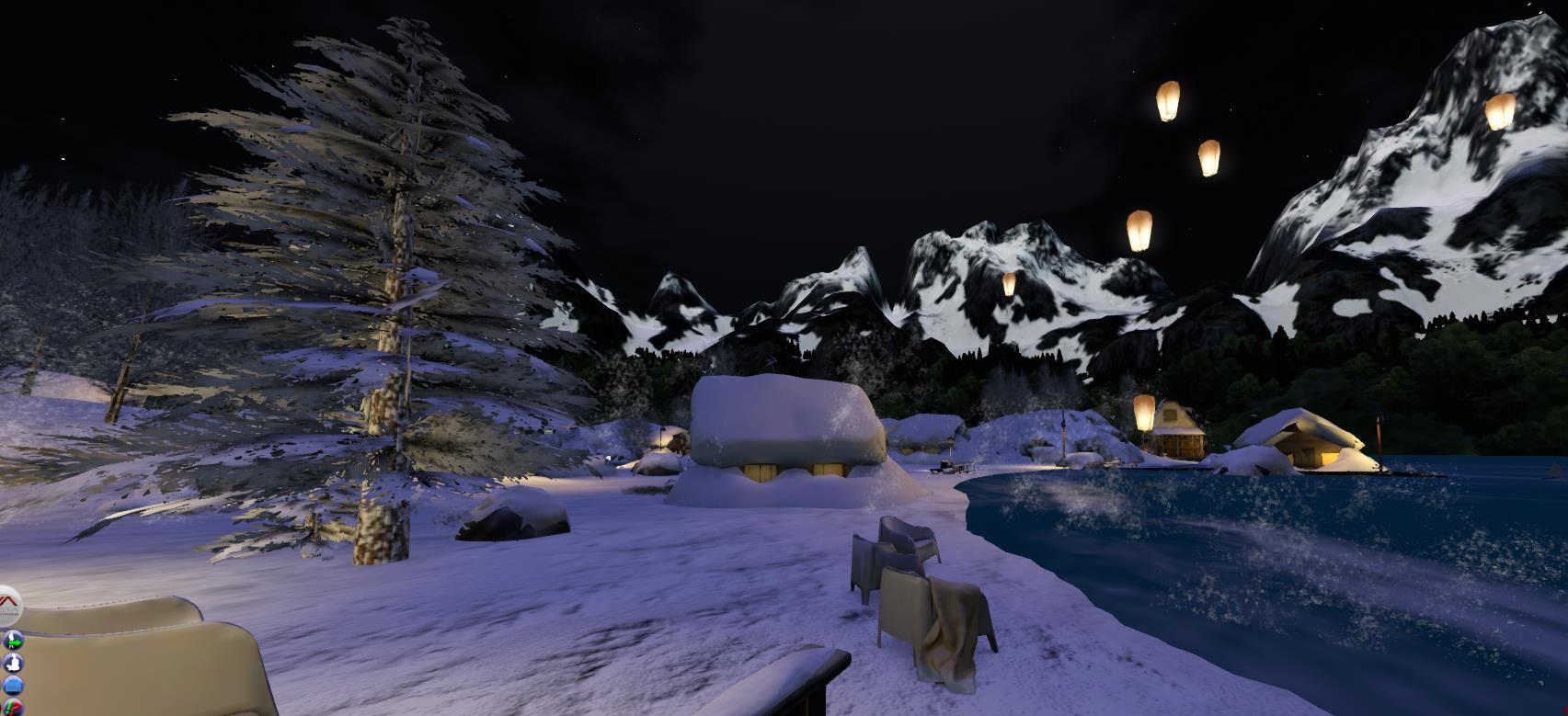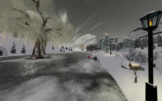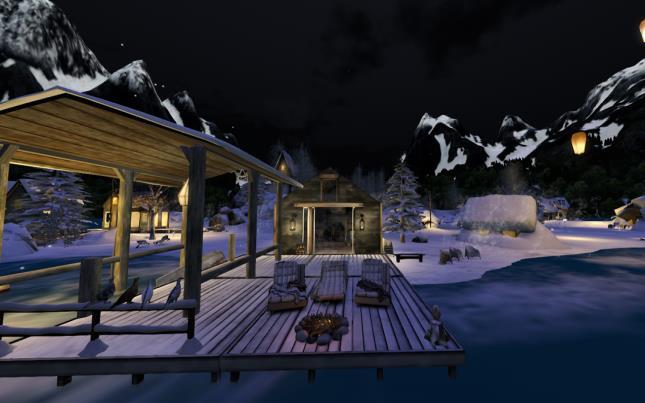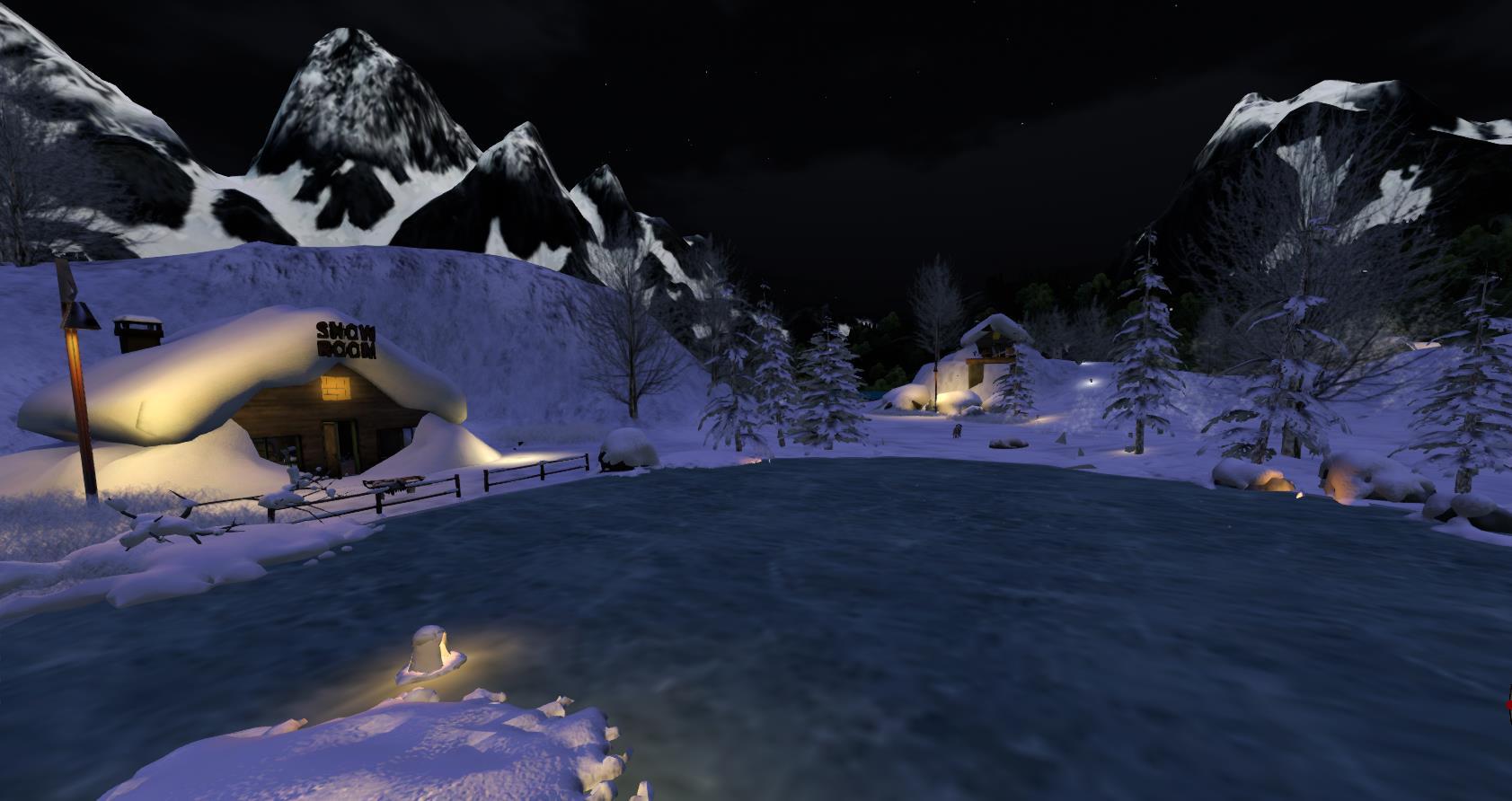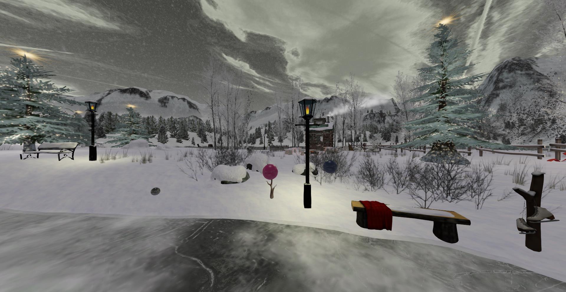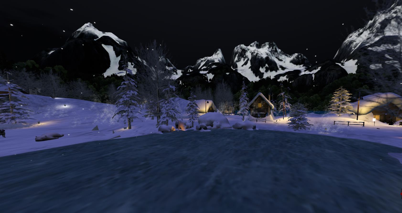More skating if you need but this time the scene is different with tall mountains looming behind giving a cool backdrop, and cute cabins nestled around the snowy edge.