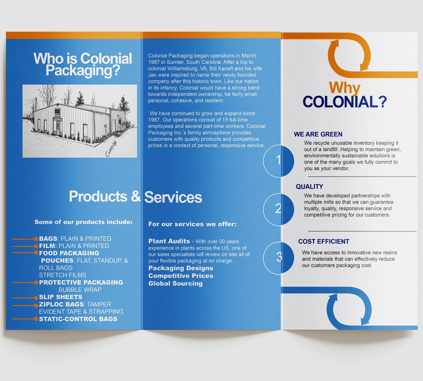 I developed a professional tri-fold brochure for Colonial Packaging, focusing on branding and visual communication. The final design was approved and funded by the company’s CEO.
