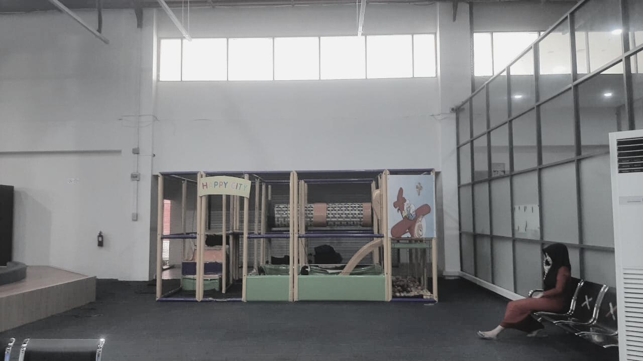 Material dominan untuk struktur terbuat dari galvanis sebagai penopang kanopi yang material utamanya wpc Material penutup lantai pada area pelayanan menggunakan stiker lantai vinyl dan stiker lantai mamer Material triplek digunakan untuk display informasi pada bagian depan booth dan sampng booth Secara keseluruhan perancangan menerapkan warna mencolok dan bentuk melengkung untuk menarik perhatian