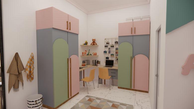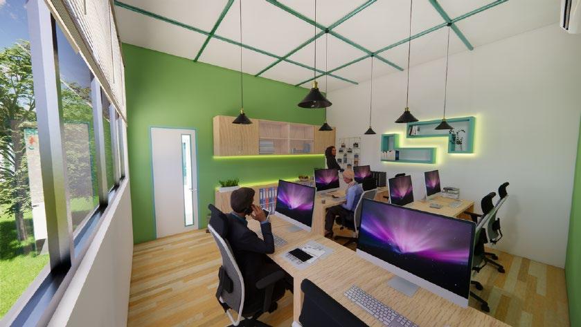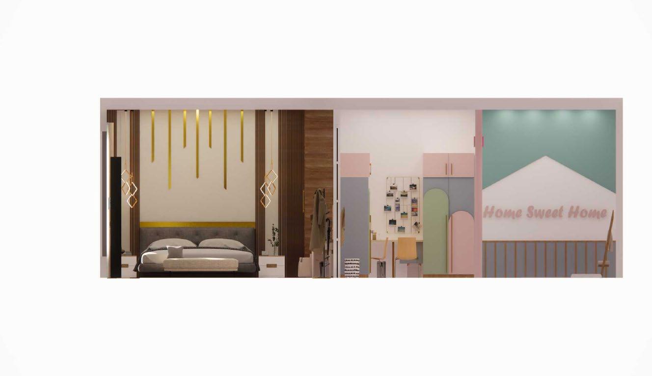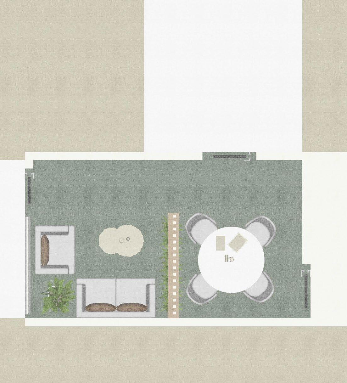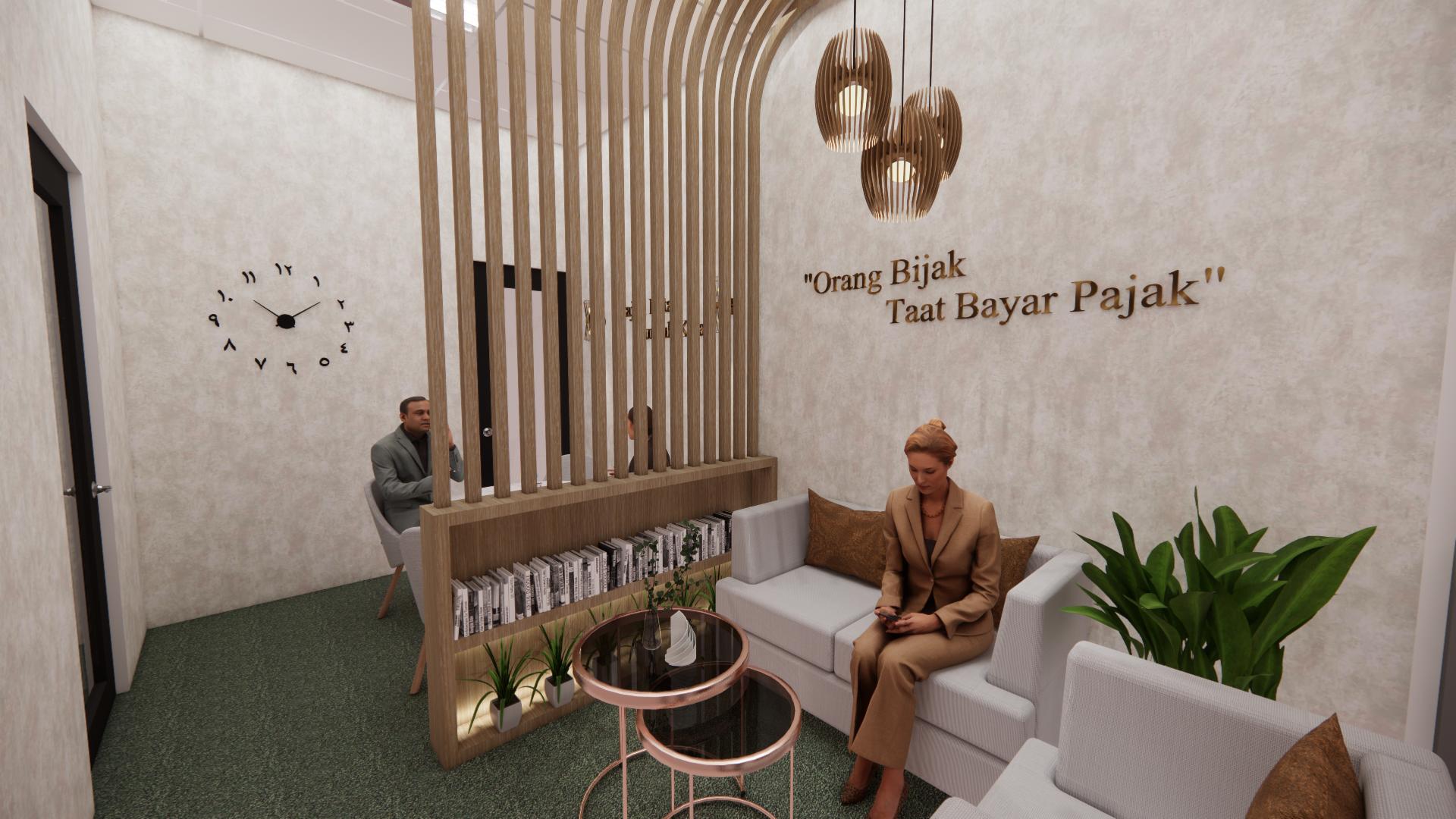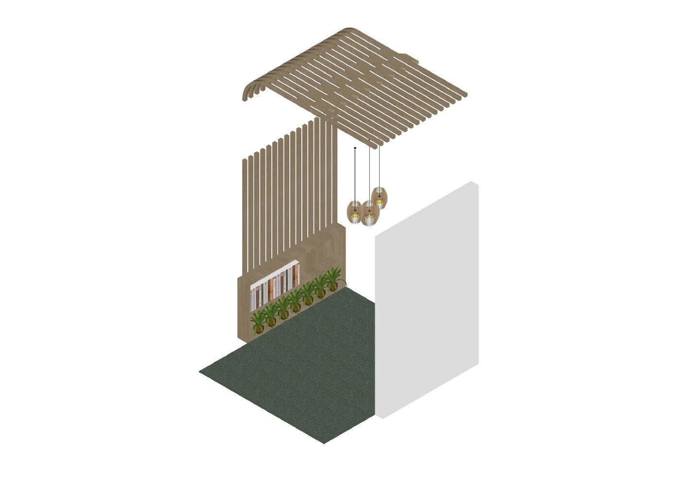 Secara keseluruhan perancangan yang baru mengganti dinding partisi solid dengan partisi dari plywood untuk menghadirkan suasana yang lebih luas namun tetap mempertegas dua ruangan yang berbeda Partisi ruangan yang hadir dapat pula difungsikan sebaagi rak buku Dekorasi ruangan dilengkapi dengan lampu rotan yang sesuai dengan suasana neteral yang diterapkan.