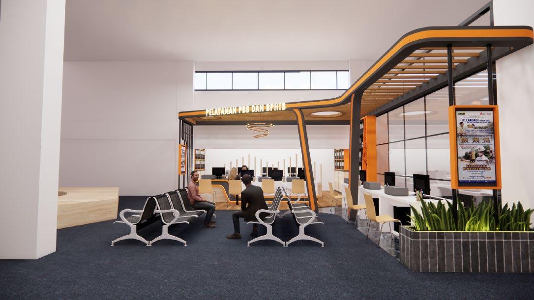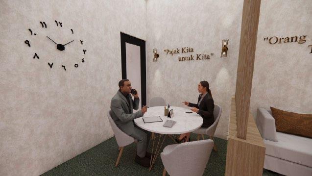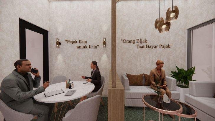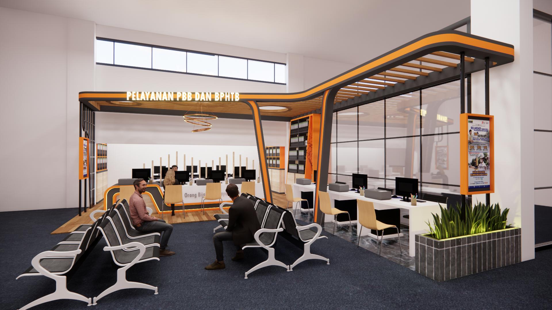 Perancangan booth dengan ukuran 9m x 10m mengutamakan penggunaan warna yang contras dan menonjol sehingga menarik perhatian pengguna yang datang Tidak hanya dengan penggunaan warna, penggunaan lampu led juga diterapkan untuk menarik perhatian Pembagian area pada booth dibagi menjadi 3 yaitu area tunggu pengguna pada bagian depan, area pelayanan, dan area pemeriksaan berkas pada area paling belakang