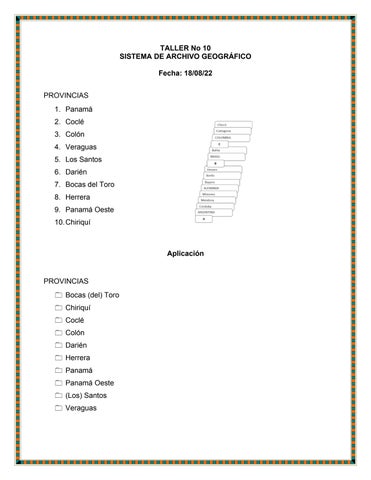 TALLER No 11 SISTEMA DE ARCHIVO GEOGRÁFICO GUÍA Fecha:-SUBGUÍA18/08/22 Veraguas ▪DariénSantiago ▪ La ChiriquíPalma ▪BocasDaviddel Toro ▪ Bocas del Toro Colón ▪ PanamáColón ▪ Ciudad de Panamá Herrera ▪ CocléChitré ▪ PanamáPenonoméOeste ▪ La Chorrera Los Santos ▪ Las Tablas