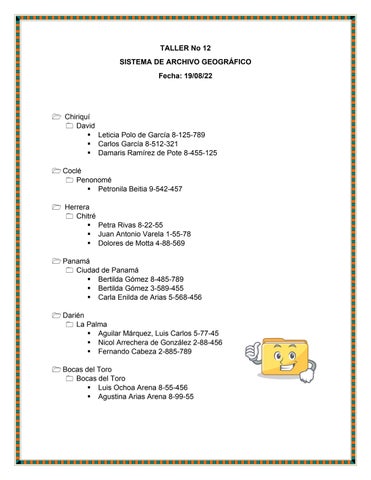 TALLER No 12 SISTEMA DE ARCHIVO GEOGRÁFICO Fecha: 19/08/22  Chiriquí  David ▪ Leticia Polo de García 8 125 789 ▪ Carlos García 8 512 321 ▪ Damaris Ramírez de Pote 8-455-125  Coclé  Penonomé ▪ Petronila Beitia 9 542 457  Herrera  Chitré ▪ Petra Rivas 8 22 55 ▪ Juan Antonio Varela 1 55 78 ▪ Dolores de Motta 4-88-569  Panamá  Ciudad de Panamá ▪ Bertilda Gómez 8 485 789 ▪ Bertilda Gómez 3-589-455 ▪ Carla Enilda de Arias 5-568-456  Darién  La Palma ▪ Aguilar Márquez, Luis Carlos 5 77 45 ▪ Nicol Arrechera de González 2-88-456 ▪ Fernando Cabeza 2 885 789  Bocas del Toro  Bocas del Toro ▪ Luis Ochoa Arena 8-55-456 ▪ Agustina Arias Arena 8-99-55