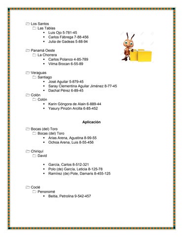 TALLER No 12 SISTEMA DE ARCHIVO GEOGRÁFICO Fecha: 19/08/22  Chiriquí  David ▪ Leticia Polo de García 8 125 789 ▪ Carlos García 8 512 321 ▪ Damaris Ramírez de Pote 8-455-125  Coclé  Penonomé ▪ Petronila Beitia 9 542 457  Herrera  Chitré ▪ Petra Rivas 8 22 55 ▪ Juan Antonio Varela 1 55 78 ▪ Dolores de Motta 4-88-569  Panamá  Ciudad de Panamá ▪ Bertilda Gómez 8 485 789 ▪ Bertilda Gómez 3-589-455 ▪ Carla Enilda de Arias 5-568-456  Darién  La Palma ▪ Aguilar Márquez, Luis Carlos 5 77 45 ▪ Nicol Arrechera de González 2-88-456 ▪ Fernando Cabeza 2 885 789  Bocas del Toro  Bocas del Toro ▪ Luis Ochoa Arena 8-55-456 ▪ Agustina Arias Arena 8-99-55