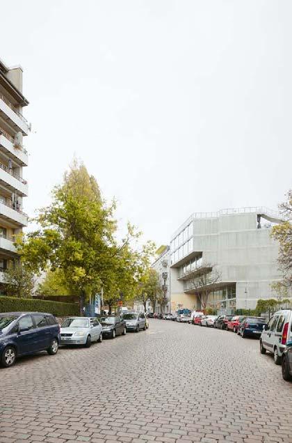 Seven of the 15 buildings were designed by Robertneun and demon strate the architectural possibilities within the specifications. At the base level, the entrances celebrate the imposing floor heights with massive entrance gates and oversized house numbers. The six floors above offer a variety of housing types, even in the narrowest of buildings: one-bedroom apartments that can be connected to neighboring duplexes if needed, full-length apartments, and apartments with interlocking split levels. The facades reflect the diversity inside, be it with a metal shelf installed in front of the house for deep loggias or balconies that protrude far from the facade. Their bold red color does not at all seem like a provocation but appears surprisingly natural. fh