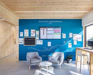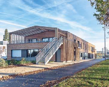 CBS-Lifteam Group offers construction systems based on solid wood elements screwed together and chemically untreated. At the Maison de la B in Mitry-Mory, for example, a single-storey residential and office building that supplements a maintenance workshop of the Paris public transport company RATP, a projectspecific storey ceiling based on the company’s O’portune ceiling module was used. The prefabricated construction system is composed of solid wood elements with cross-sections from 60/120 mm to 60/260 mm and lengths from 4 to 11 metres. These are screwed together alternately at different heights, which increases the static height of the ceiling with low material consumption. Depending on the load – the system is designed for 250 to 500 kg/m² – an OSB or laminated veneer lumber panel or, for high concentrated loads, a cross-laminated timber element forms the upper end. The fire resistance of the wooden ceiling is classified as REI 30. The building was realised according to a design by Dominique Dosne from the French state railway company SNCF, with the CBSLifteam Group being responsible for the design, manufacture and execution of the wooden structure, including the building envelope.
