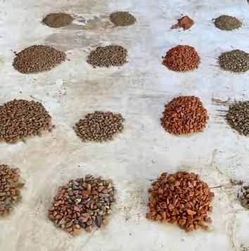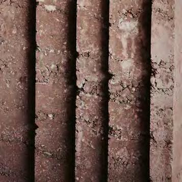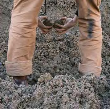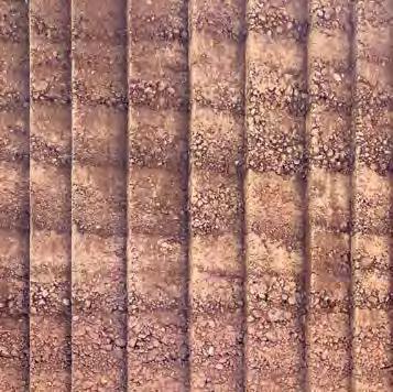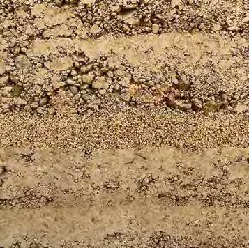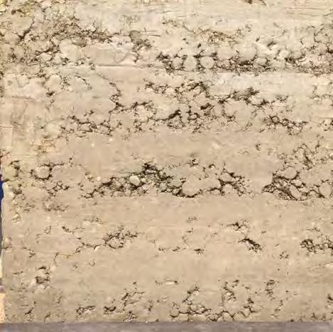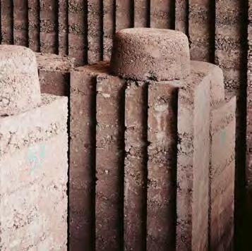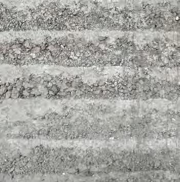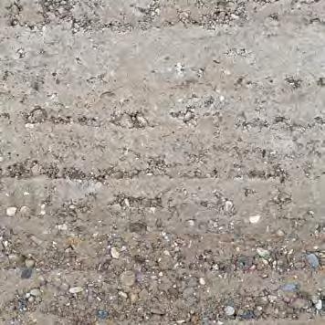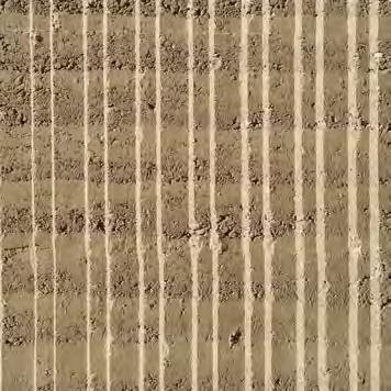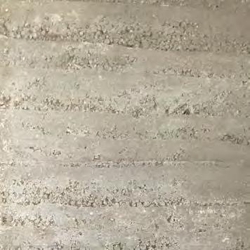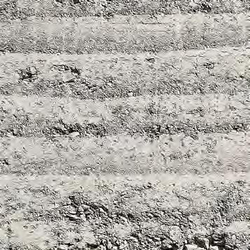to guarantee the suitability of the resource for use in rammed earth construction (see “Grain size distribution and test mixes”, p. 43f.). B horizons with a homogeneous composition of clay, silt, sand, and gravel are particularly interesting for rammed earth construction. They display an optimal grain distribution and cohesion, essential for the creation of earthen walls with the highest possible loadbearing capacity. The C horizon is located beneath it and mostly consists of unweathered or partially eroded parent rock. In many cases, the material sourced from the C horizon is extracted mechanically or by blasting, after which it is processed for different building purposes. In the context of rammed earth construction, this horizon is suitable as a source of mineral aggregate, such as coarse, gravelly material in order to optimise grain distribution. Differentiating between the three soil horizons is decisive to identify the suitable source of materials for rammed earth construction in a targeted way and, at the same time, ensure the sustainable use of soil as a resource.