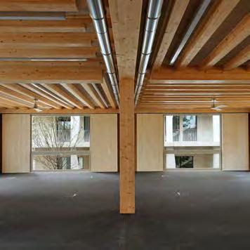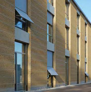 for wall constructions. The integration of additional insulation materials such as cork, straw, hemp fibre or conventional materials in hybrid building components allows optimising thermal characteristics accordingly. For this purpose, it is particularly important to achieve an improved thermal insulation effect without obstructing the breathability of the material. A realised example with such hybrid building parts is the Alnatura company headquarters in Darmstadt (see p. 102ff.). The rammed earth facade was created with prefabricated elements into which an insulating layer of glass foam gravel and, oriented inward, building component activation were integrated. The self-supporting wall sections with building component activation border the interior, which is sensible in terms of loadbearing function