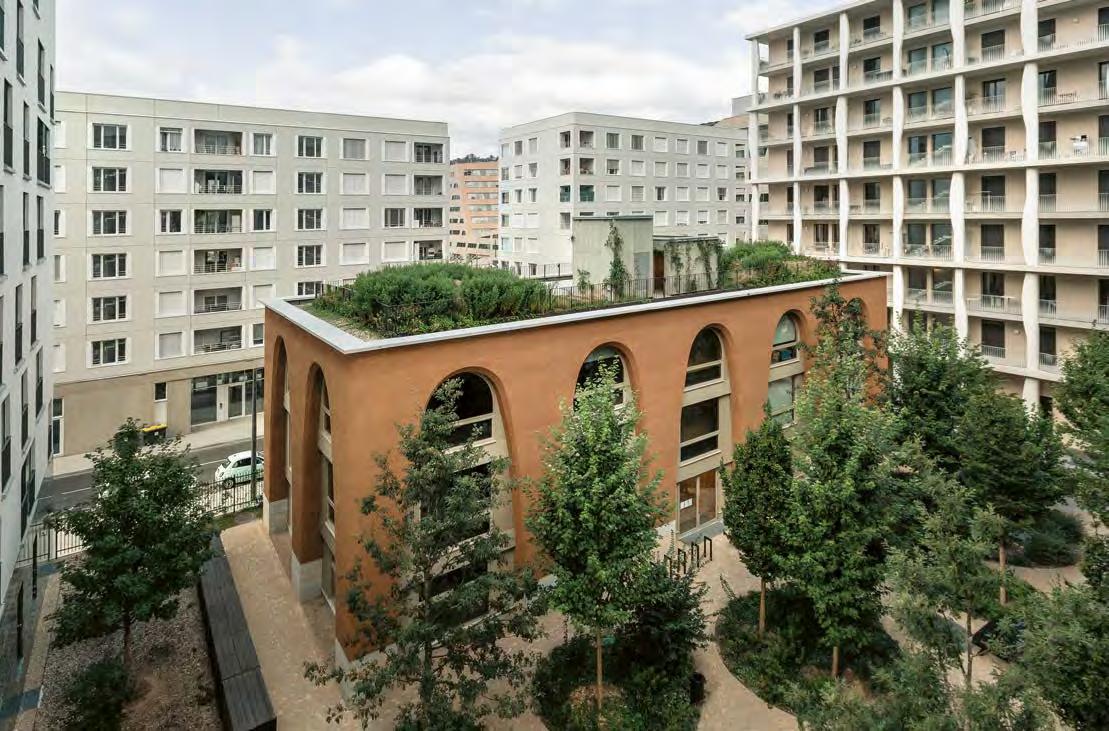 L’Orangerie is an office building located on the peninsula between the Rhône and Saône rivers in the new urban district La Confluence in Lyon. The three-storey building contains coworking spaces, sheltered in the urban context on a property surrounded by tall residential structures. The planning team paid homage to the many examples of the rammed earth construction tradition of the Rhône-Alpes region: It combined earthen materials for loadbearing exterior walls with cross laminated timber for the ceilings, the interior loadbearing elements, and the access core. Altogether 380 t of the material were sourced from a