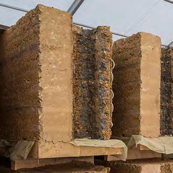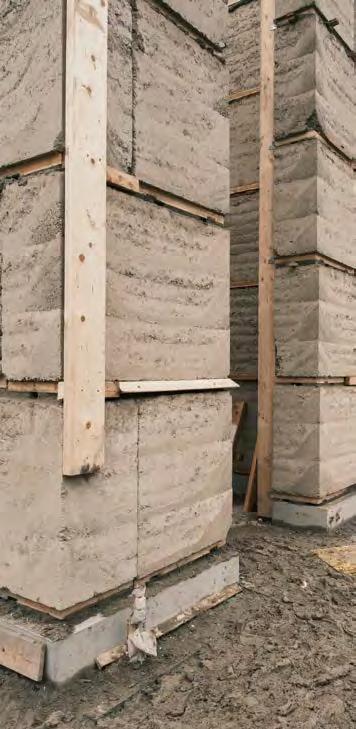 rificial formwork. Such elements can, for instance, serve as a base plate for loam formwork during production. They also offer opportunities for the assembly of built-in elements, anchors (see “Improving mechanical stability and loadbearing capacity”, p. 76) and temporary or even final weather protection measures such as weatherboard or drip edges. As a result, the entire construction process can be accelerated, since the subsequent work steps can be omitted. Elements can be assembled more quickly and, in ideal cases, receive long-term protection from weather impacts. A descriptive example is the kiln tower and its elements (see p. 94ff.). The 60 cm thick base plates consisting of threelayer wood panels were foundational for prefabrication. The three sides of the