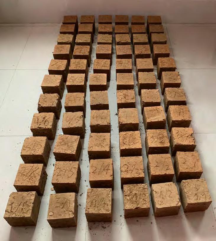 mass content of clay and silt is reduced. As a result, the grade curve approximates the ideal grain size distribution for rammed earth. After adapting the grain size composition, the material is provided with the optimal moisture content. The aim is to simulate a realistic manufacturing situation and in follow create four to six samples in the form of compacted test cubes measuring 20 ≈ 20 ≈ 20 cm. They are smoothed on their top and bottom