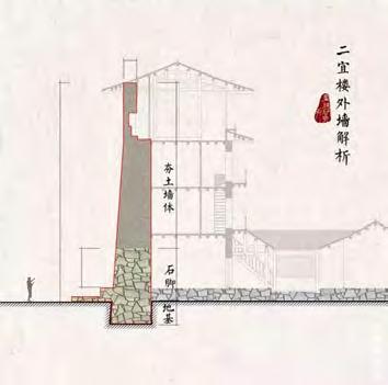 bearing walls was also made of natural stone and gravel. The upper and larger section, however, consists of rammed earth. The circular or rectangular basic forms are stiffened as such and by crosswalls, thus providing earthquake safety. The largest tulou have diameters of more than 80 m and a height of four to five storeys. The protective exterior wall was expanded in the interior by a timber structure that establishes rooms with specific functions (Fig. 2 d). The lower floors served for cooking and housekeeping purposes. The upper floors featured mostly bedrooms. The roof structures are also made of timber and display fired clay roofing tile. Roofs cantilever by about 2 m and afford the walls protection from rain and erosion [2].