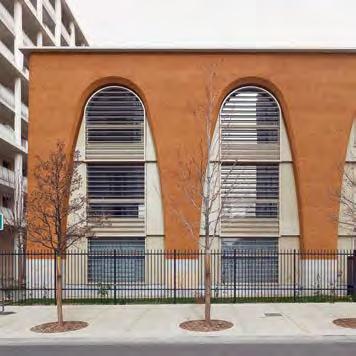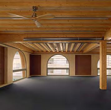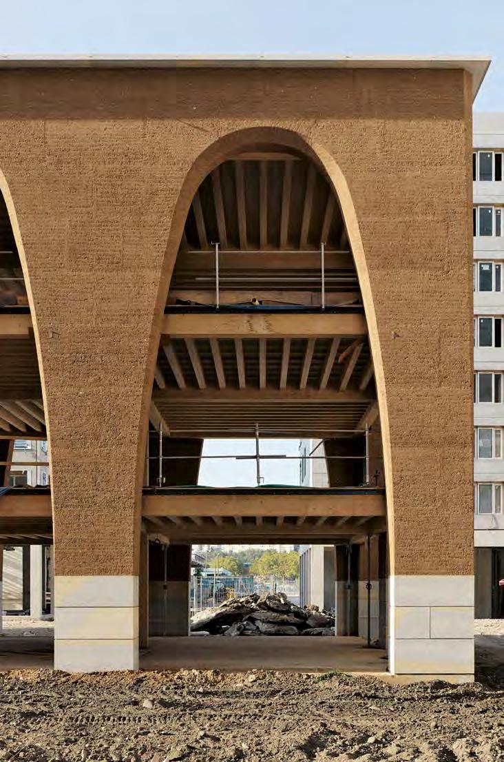 both their thickness and their dead load decrease. The building demonstrates that a wall consisting of 14 ethereal arches can be created with loadbearing and unstabilised rammed earth. The timber beam ceiling is directly connected to the metal bearings embedded in the rammed earth elements, enabling an even distribution of loads. The walls are set on top of a plinth comprised of three layers of natural stone blocks. The parapet coping also consists of natural stone. The earthen walls are not insulated, yet regulate the indoor climate naturally, allowing for mechanical climate control to be omitted.
