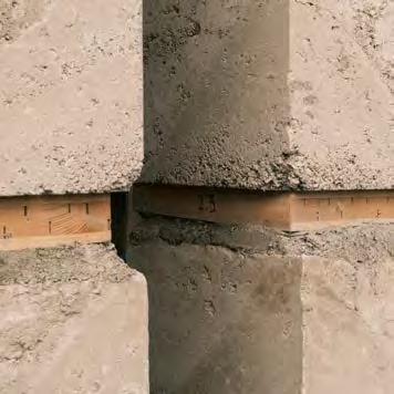 Due to its specific material characteristics, rammed earth displays limited loadbearing capacity, most of all when subject to tensile and bending stress. To compensate for this weakness, structural reinforcement consisting of wood, concrete, steel, or plastic can be incorporated into hybrid parts. For instance, reinforcement such as geotextile mesh, steel rebar, entire timber beams, reinforced concrete members, or brick lintels can be integrated in rammed earth components in order to bear tensile loads in a targeted way. This enables the general loadbearing capacity of the structural system to be increased and the realisation of more complex geometries or spanning greater widths above openings in walls. One example is the combination of rammed earth and other materials aimed at improving the loadbearing capacity of the plinth facade of the H 1 Zwhatt high-rise by Boltshauser Architekten in Regensdorf north of Zurich (Fig. 1 a – e). The loadbearing structure behind the plinth facade, which encloses the first