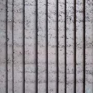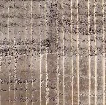 feasibility of the facade. They remain invisible, since the architectural design called for a consistently monolithic appearance that harmonised with the other building materials. For this purpose, pigment was added to the earthen mix in order to create a homogeneous mineral appearance in combination with the concrete, dyed in corresponding hues. The elements were also adorned with a relief pattern in order to simplify retouching the gaps for visual purposes and providing the facade with an optimally homogeneous appearance (Fig. 7 a – c, p. 66). The individually designed relief patterns were created by attaching silicone templates specifically created for the project to the formwork interior. The robust material can withstand the significant forces exerted during ramming.