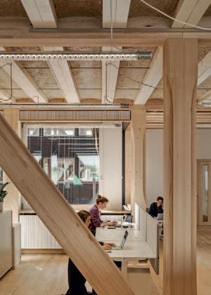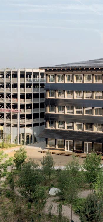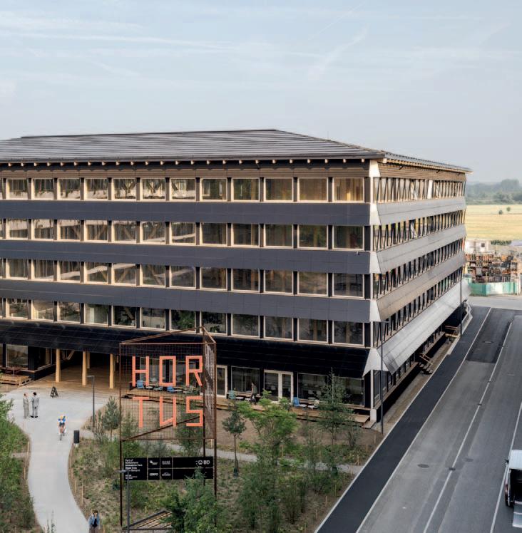 Das fünfgeschossige Bürogebäude Hortus dient Herzog & de Meuron als Experimentierfeld nachhaltiger Architektur in großem Maßstab. Zentrale Elemente der Holzkons truktion sind die Holz-Lehm-Decke und die Photovoltaik-Fassade.