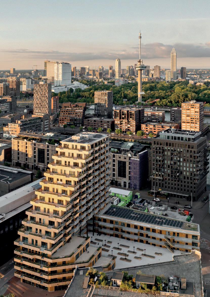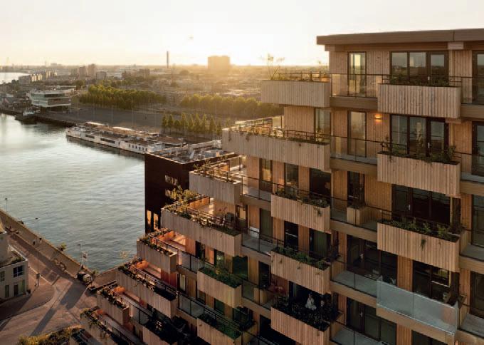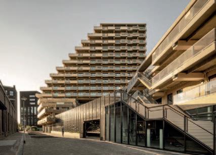 Fast 110 Wohnungen sind in Sawa entstan den, einem der größ ten Holzbauten in Rot terdam. Der bis zu sechzehngeschossige Gebäudekomplex bil det den Schlussstein der Bebauung im Lloydkwartier.