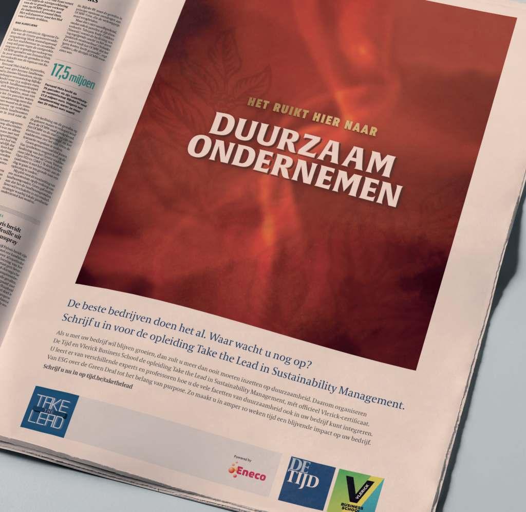 Schrijf u dit jaar wél in voor de opleiding Take the Lead in Sustainability Management want rapporteren over duurzaamheid wordt we elijk verplicht. Duurzaam ondernemen. Uiteraard doet u dat al, maar vanaf 2025 moet u er ook verplicht over rapporteren. Daarom organiseren De Tijd en Vlerick Business School de opleiding Take the Lead in Sustainability Management, mét officieel Vlerick-certificaat. U ontdekt er hoe u de vele face en van duurzaamheid in uw bedrijf kunt integreren en hoe u hierover moet rapporteren. Zo kunt u volgend jaar deze advertentie negeren.