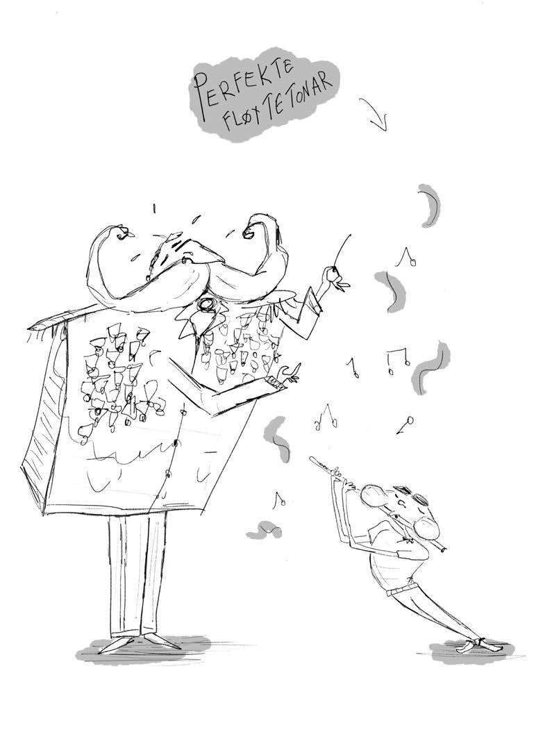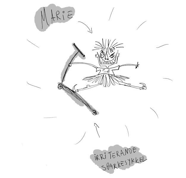 «Egveitatdetikkjeer lov,mennokonmåtaansvar ogprøveåmosedenfløyta.Såmesleppåhøyrepå piperiadine.»Marielagarstyggepipelydarmedanho heldsparkesykkelensomeitverrfløyte.OrionserfortvilapåIrinoggestikulerermotMarie.Irinskjønar teikningaogtarsykkelen.