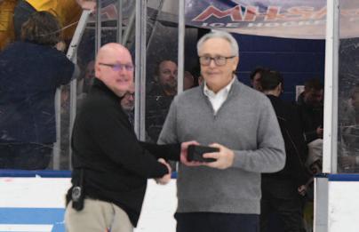 1968 - J IM GIBBONS received special recognition from the MHSAA for his 40 years of service as a Cross Country and Track & Field official. The award was presented by Cody Inglis, the MHSAA Assistant Director in charge of Cross Country, Hockey, and Track & Field, at the Hockey State Championship game in March.