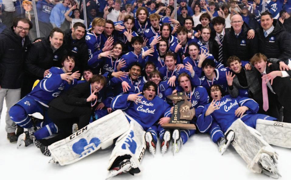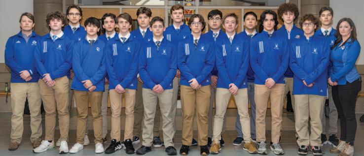 Varsity Hockey, led by Coach Brandon Kaleniecki ’00, finished the season with an incredible record of 29-1. Their only loss, 2-1, came to Notre Dame Academy from Wisconsin. The Shamrocks dominated the season and won the CHSL, MIHL, and regional championships en route to winning their fourth-consecutive Division 1 State Championship, a 3-0 victory over Brighton. CC also became the first team in the 49-year history of the MHSAA tournament to not surrender a goal in the playoffs thanks to stellar play from goalies Kyle Moore ’23 and Luca Naurato ’23 who alternated games in net.