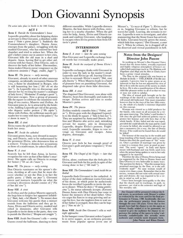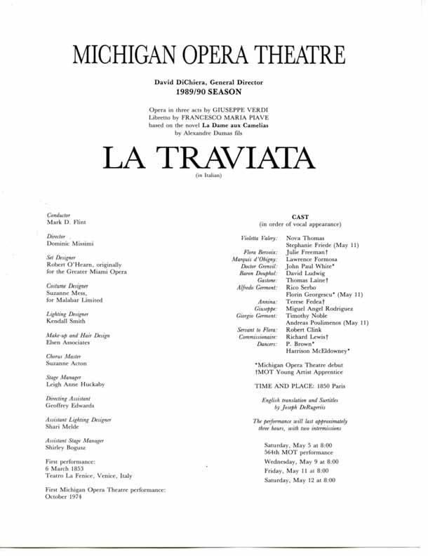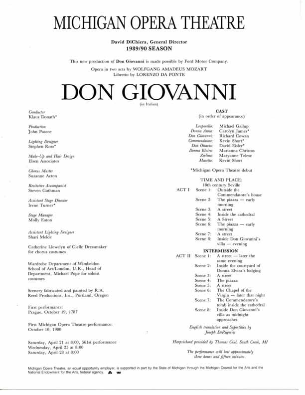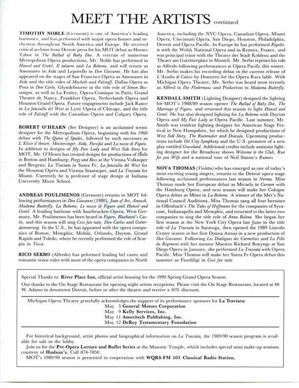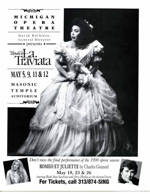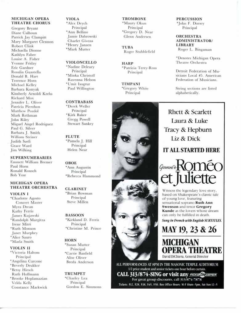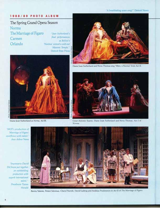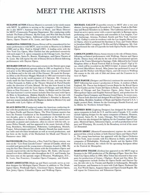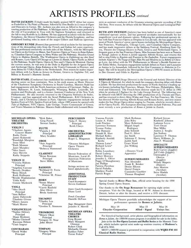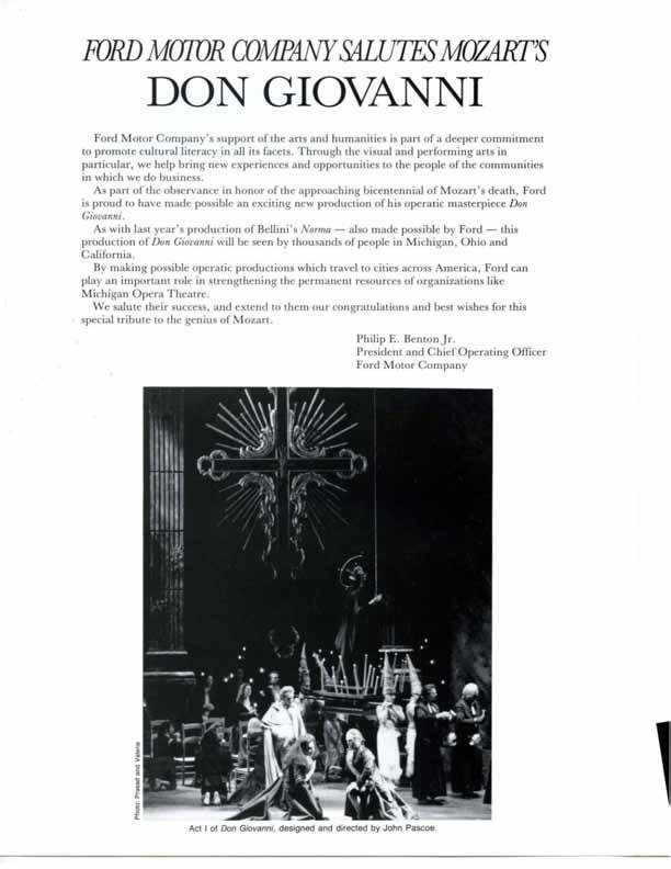 I am sure yo u will also welcome back with me English artist John Pascoe who last spring designed and directed Dame Joan Sutherland's final production of Norma, and who returns this spring for an all new production of Don Giovanni. In the title role, attesting to the strength of our nationally recognized Young Artist Apprentice Program, former vocal intern Richard Cowan returns to Michigan Opera Theatre on the brink of an international operatic career. Later in the season, two lovely sopranos, Nova Thomas and Stephanie Friede , return to the Detroit opera stage alternating in the coveted title role of La Traviata The season climaxes with the long-awaited debuts of two of the world's most acclaimed young opera stars Ruth Ann Swenson and Jerry Hadley in Romeo et Juliette. Finally, I sincerely wish to express my gratitude for your continued contributions of time, money, and talent. For this is the foundation upon which we can continue to build a valuable cultural resource for the City of Detroit and the State of Michigan.