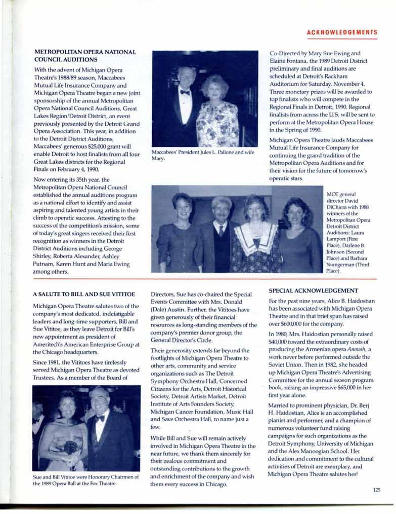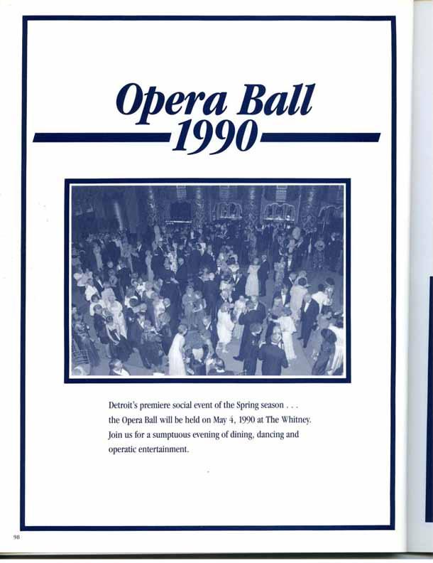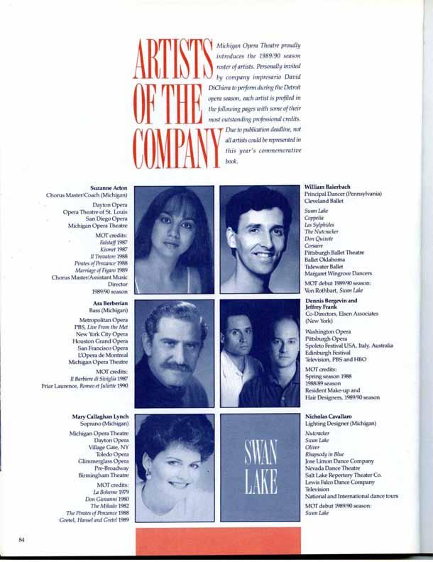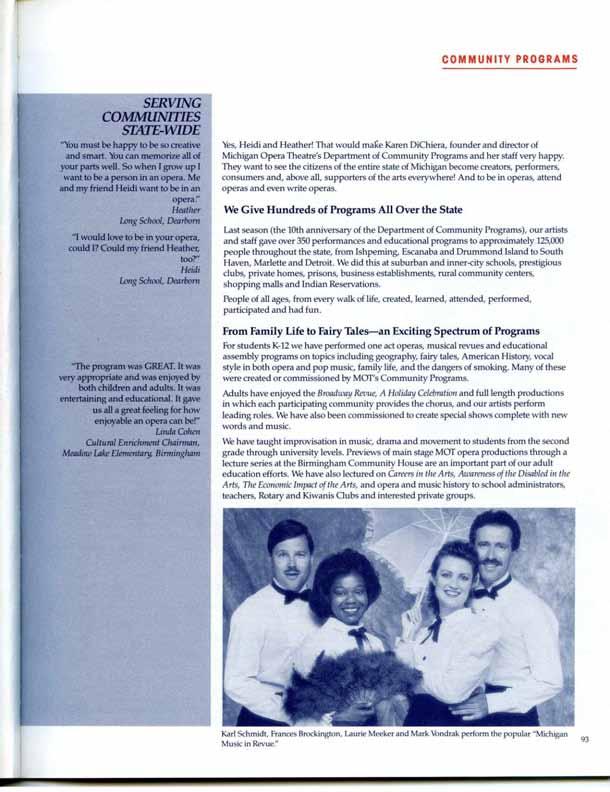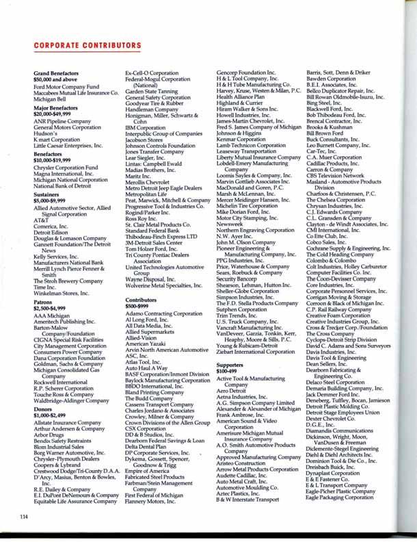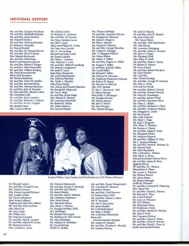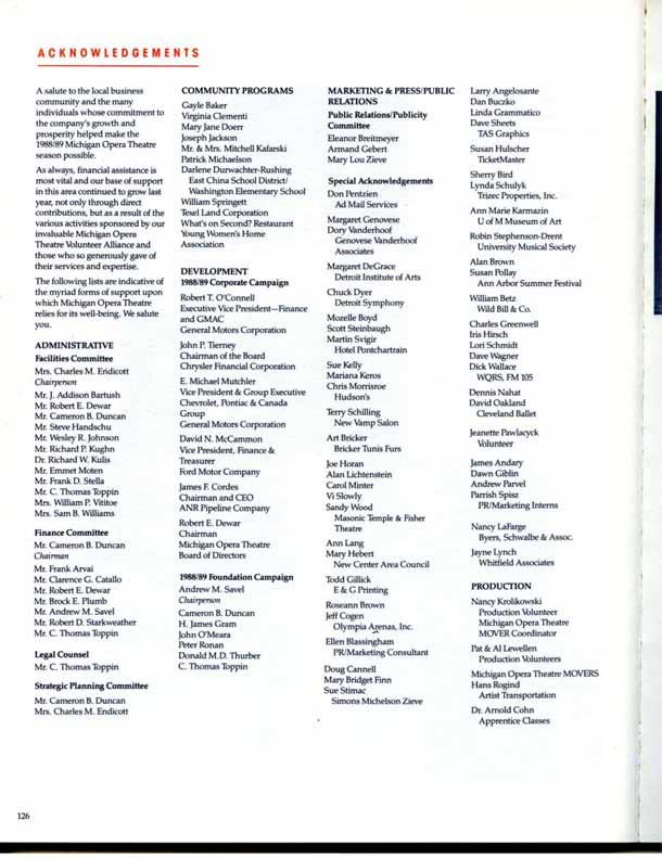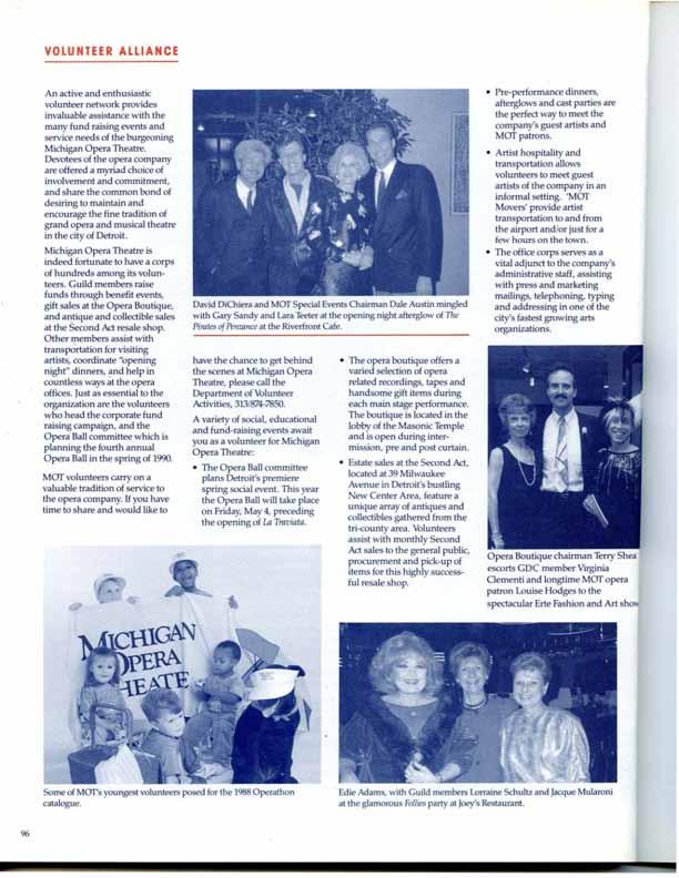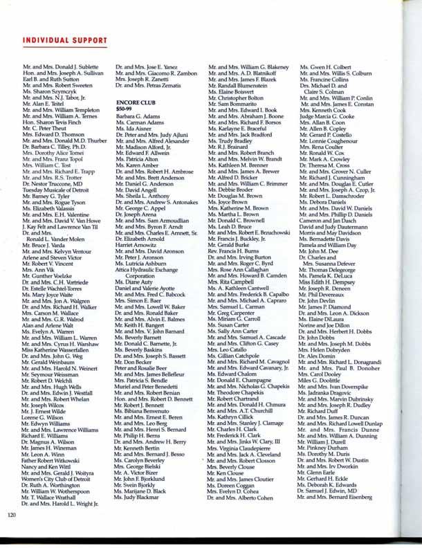 We also pause within these pages to laud the efforts and financial contributions of so many concerned and dedicated patrons, corporations and foundations that have generously contributed to the company, one of Detroit's finest cultuml treasures. Similarly, we acknowledge our many volunteers and salute their continued efforts at promoting our activities.