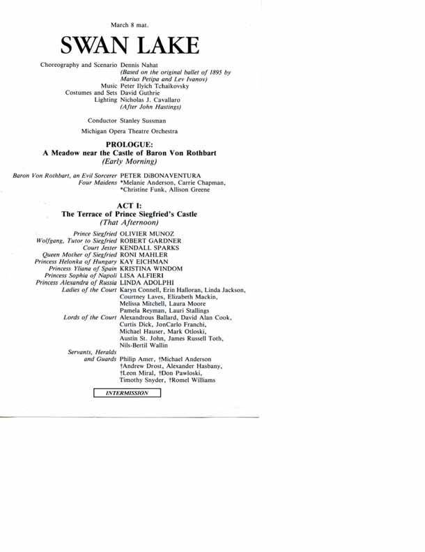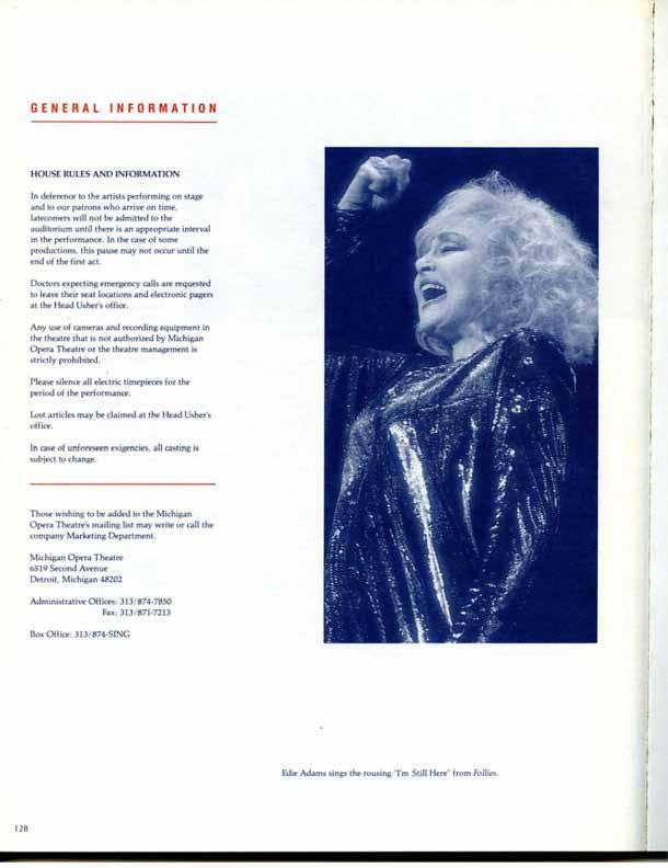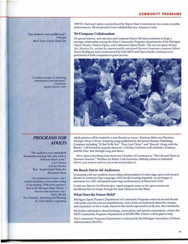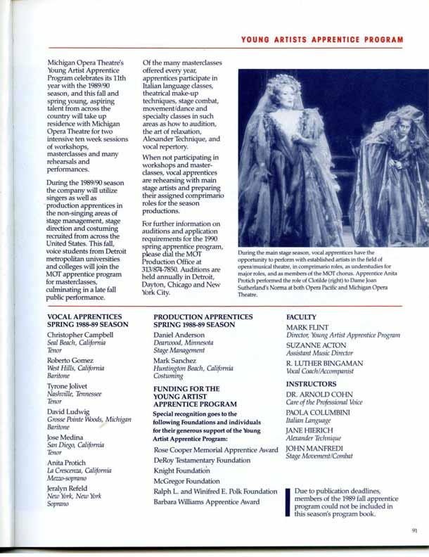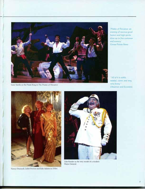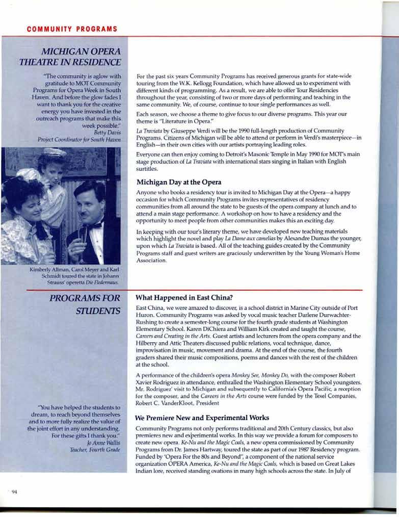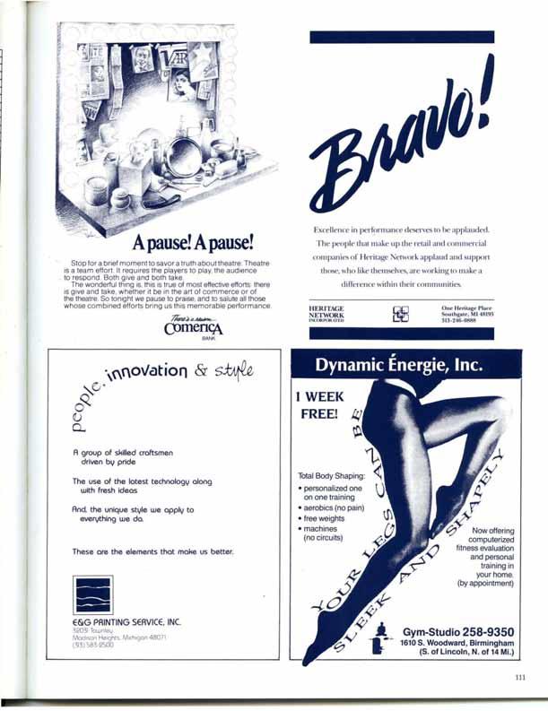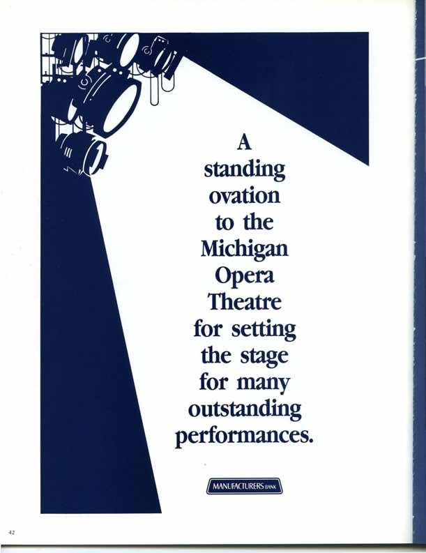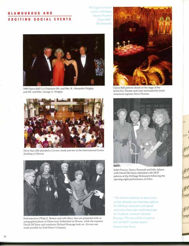 We also pause within these pages to laud the efforts and financial contributions of so many concerned and dedicated patrons, corporations and foundations that have generously contributed to the company, one of Detroit's finest cultuml treasures. Similarly, we acknowledge our many volunteers and salute their continued efforts at promoting our activities.